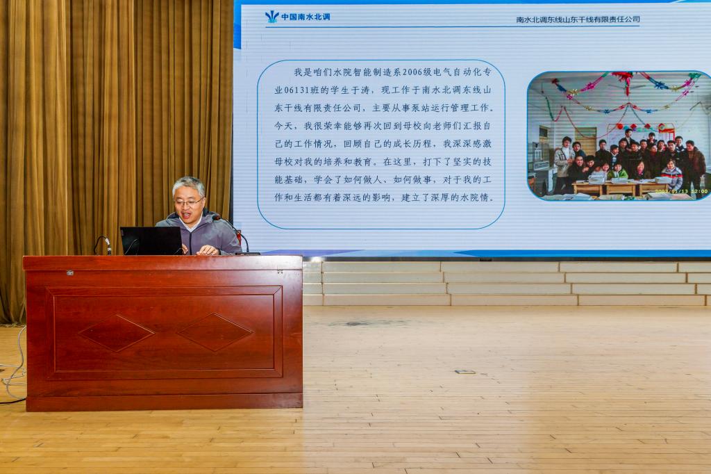 于涛是学院2006级电气自动化专业学生,2009年入职南水北调,深耕泵站运行管理十余年。讲座中,他回顾在母校打下的坚实技能基础,从直面工作难题、积累技能、创新技术、赛场争辉及传承匠心等多个方面,分享从工程一线新人,成长为获得山东省富民兴鲁劳动奖章、全国水利技能大奖等荣誉的行家里手的奋斗历程,为学弟学妹们指明职业发展方向,助力他们做好职业生涯规划。