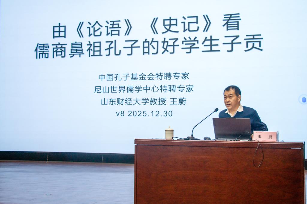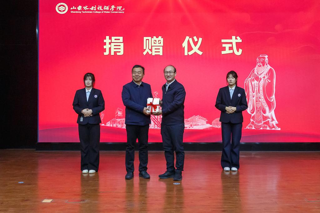 仪式在学院学生表演的诗朗诵《仁者的叮咛——致敬孔子》中拉开序幕。万斌与刘皓共同为“山东水利技师学院孔子学堂”揭牌;边敦典代表学院接受尼山世界儒学中心与内蒙古赤峰市龙行美楷孔子学堂捐赠的图书和字贴教材;现场师生聆听了王蔚教授的专题讲座《孔子的好学生子贡》,在深入浅出的沉浸式讲述中,引发了大家对构建新型师生关系的深刻思考。