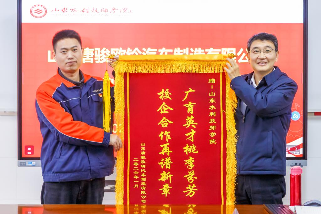 1月20日,山东唐骏欧铃汽车制造有限公司人才经营部部长杨亚臣一行3人到学院开展校企产教融合交流座谈,并为学院送来表达感谢的锦旗和优秀实习生喜报、优秀带队实习教师荣誉证书。学院交通工程系全体教师参会。学院党委委员孙大广出席会议。