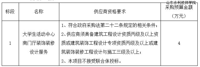 山东水利技师学院现对大学生活动中心南门厅装饰装修设计服务采购项目组织竞争性磋商采购,欢迎合格的供应商前来洽谈。