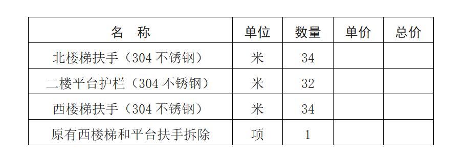 (一)主要包括学生食堂室外北楼梯护栏安装、西楼梯护栏和平台拆除及安装。施工要求,材料均使用304不锈钢,其中63管壁厚1.2mm ,38管壁厚1mm , 32管壁厚0.8mm , 22管壁厚0.6mm 。北楼梯扶手高度1.2m ,西楼梯扶手1m,平台护栏高度1.2m。以上所有的计量数据均以实测数据为准,安装效果,美观大方。报价时请携带样品。工程量清单如下: