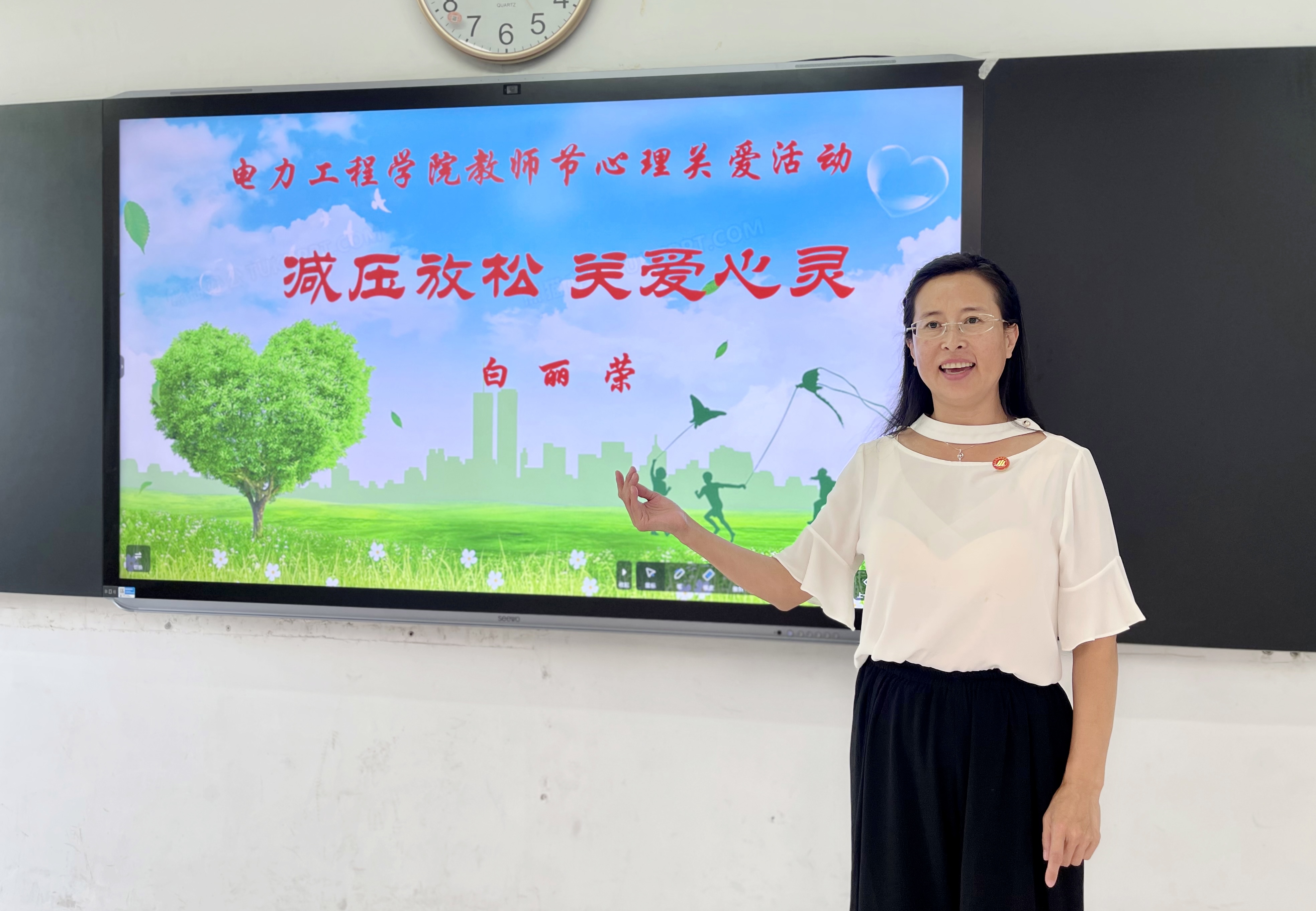 静思、冥想、启发、引导,在轻柔的话语中,在音乐的陪伴下,老师们进入到一个轻松的世界。9月6日下午,学院心理咨询师白丽荣以《减压放松 关爱心灵》为题,为老师们上了一堂心理关爱体验课,不仅使老师们疏解了压力放松了身心,更洞见了自己的潜意识,从而激发潜能,从心灵深处实现转化和蜕变,以更加饱满的精神状态投入到教育教学中。