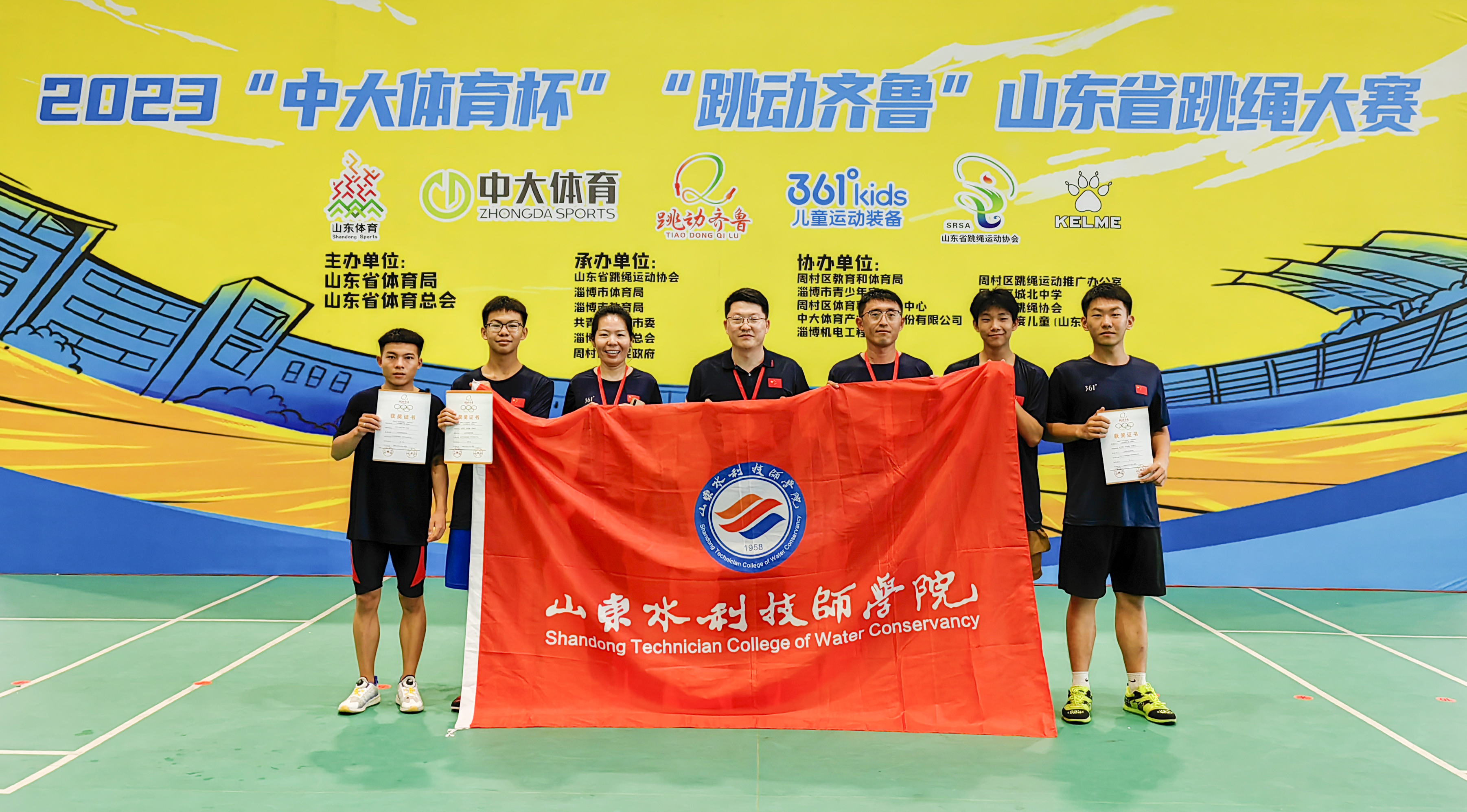 8月25日-27日,山东省跳绳大赛(淄博站)如期开赛。山东水利技师学院跳绳运动队同来自全省各地市的47支队伍500余名运动员同台竞技,最终斩获5个第一名、2个第二名、3个第三名、1个第四名的优异成绩,教师田伟、李娜获评“优秀教练员”。