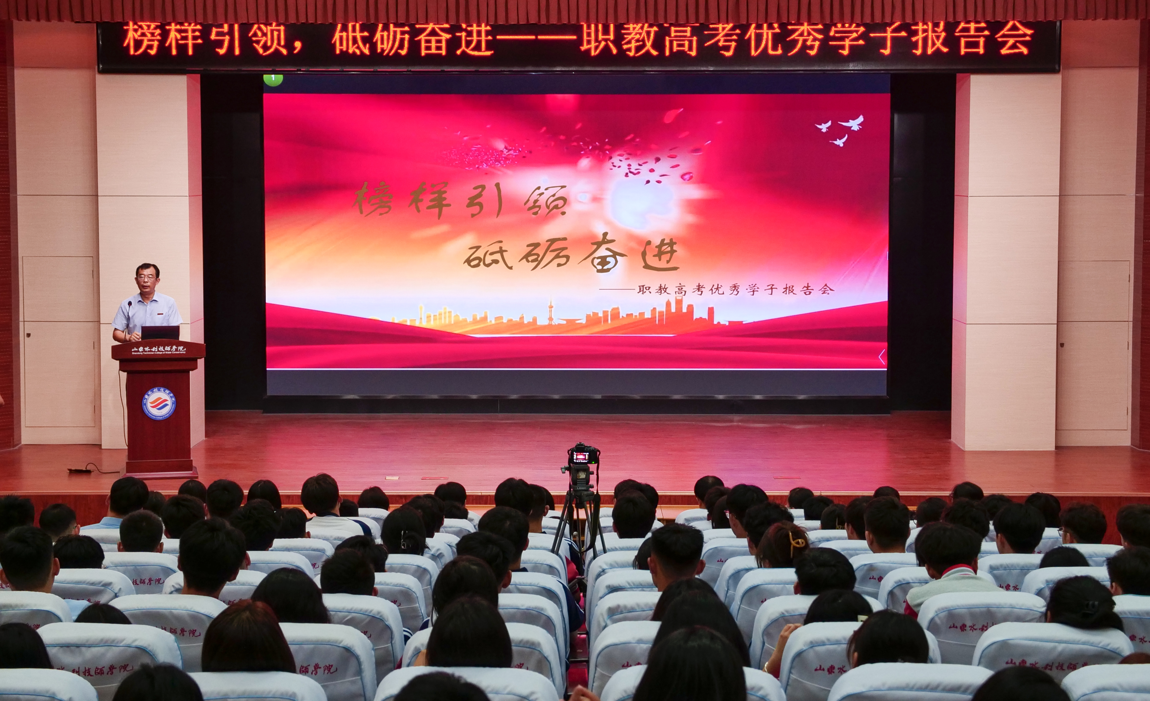 8月21日,山东水利技师学院通识教育部举办了“榜样引领 砥砺奋进——职教高考优秀学子报告会”,邀请三位自学院毕业的2020级职教高考优秀学子代表回校作学习经验交流。学院党委委员孙大广出席有关活动。2021级职教高考班和2023级网络技术专业职教高考班辅导员、教学班主任、任课教师,以及通识教育部全体教职工350余人参会。