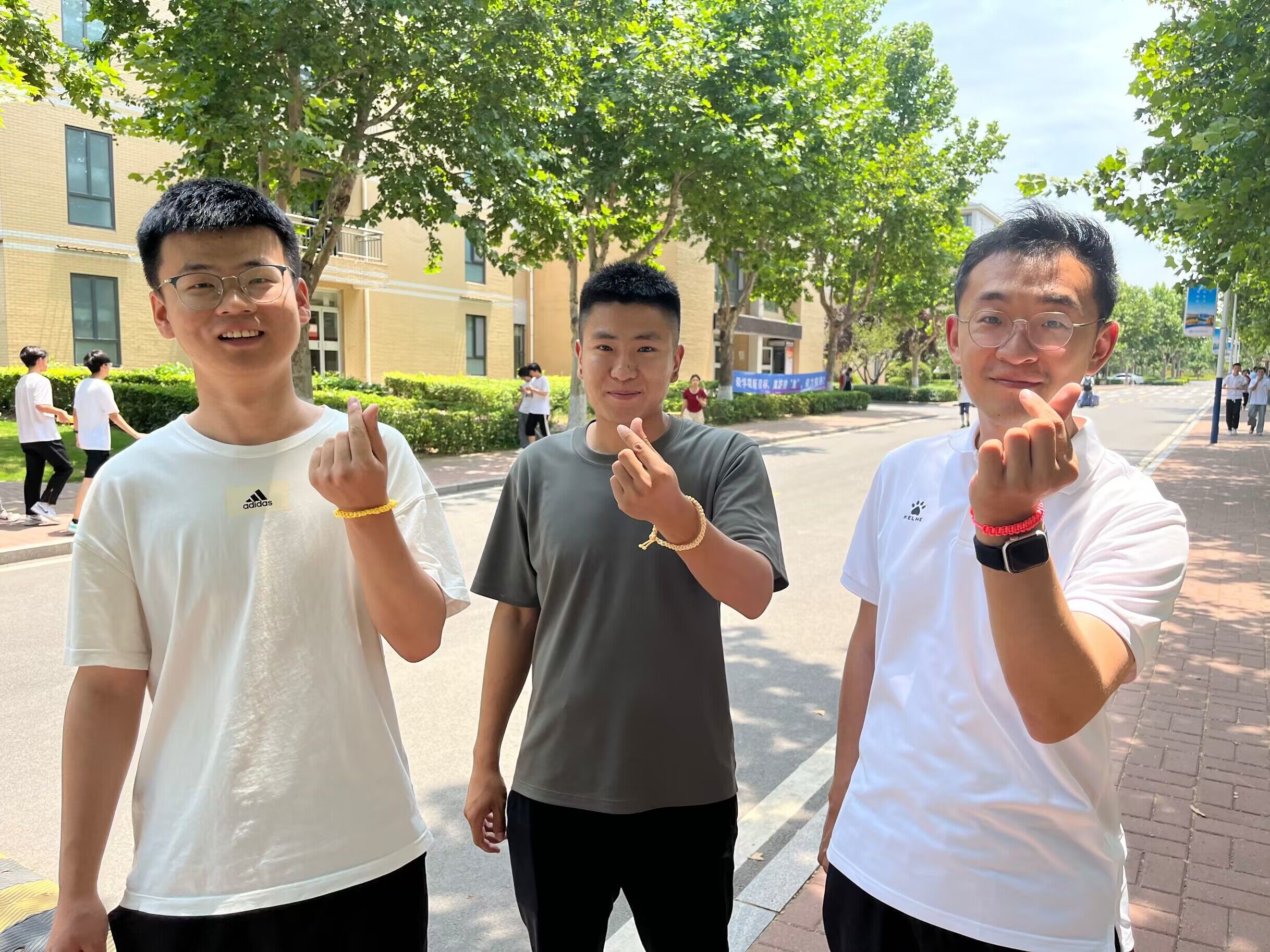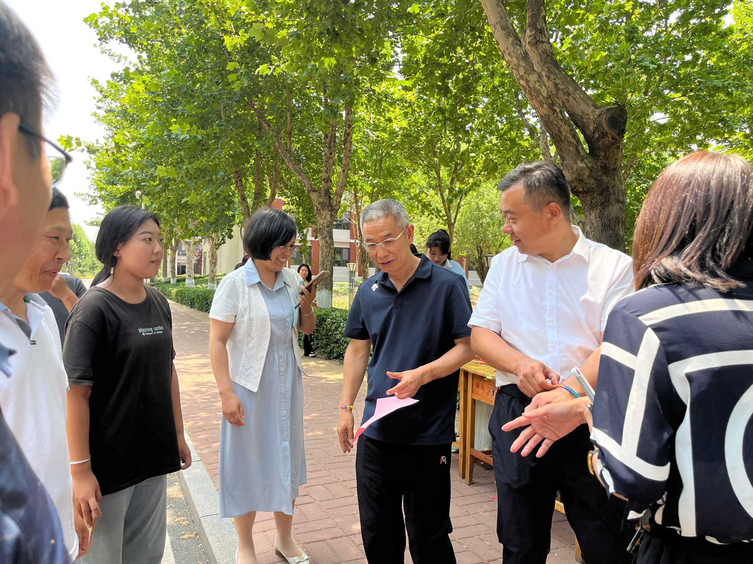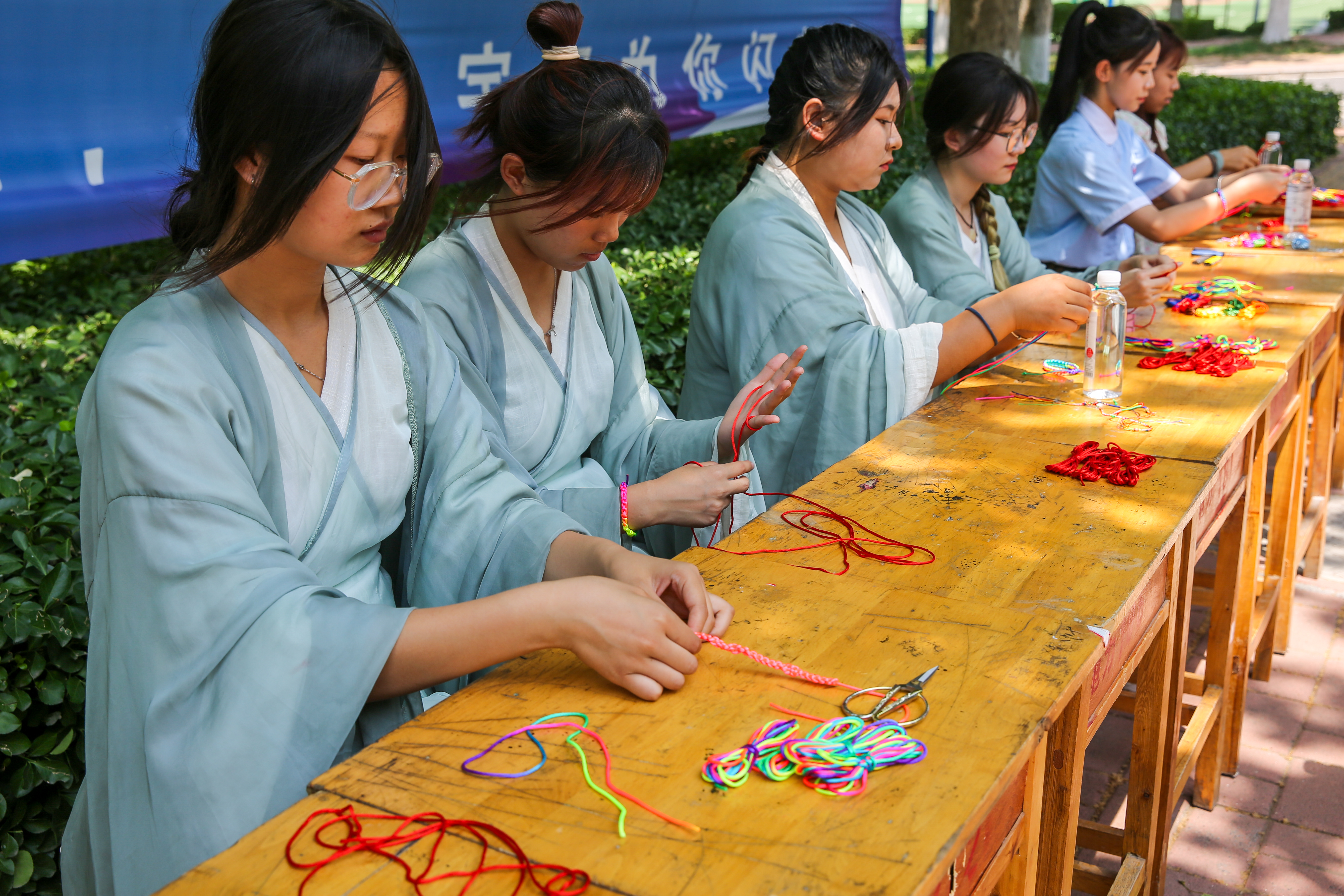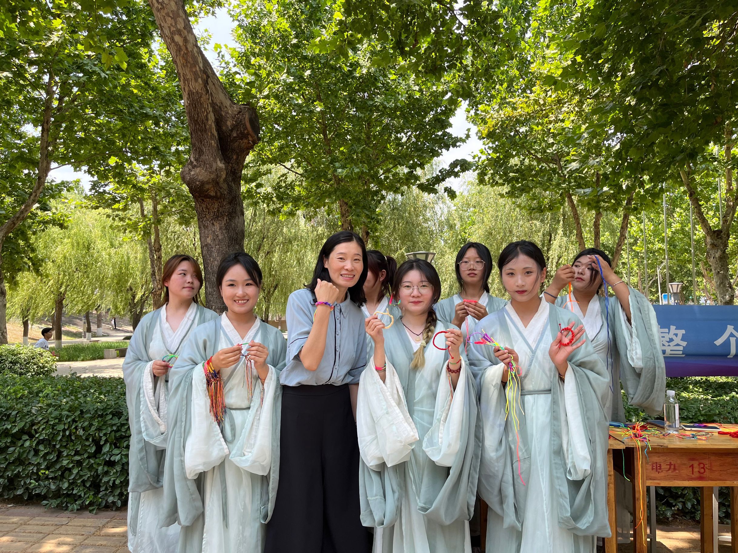 端午节系五彩绳具有辟邪和祈福纳吉的美好寓意。在活动现场,老师带着身穿青绿汉服的同学们分工协作,理线、系线、编花、打结、系扣,手工编织着一个个承载着祝福、吉祥的五彩手绳。活动期间正值学生下课,路过编绳现场,纷纷驻足观看,很感兴趣。活动人员还将编织好的五彩绳送给路过的老师和学生,将这份美好的祝愿传递给更多的人。