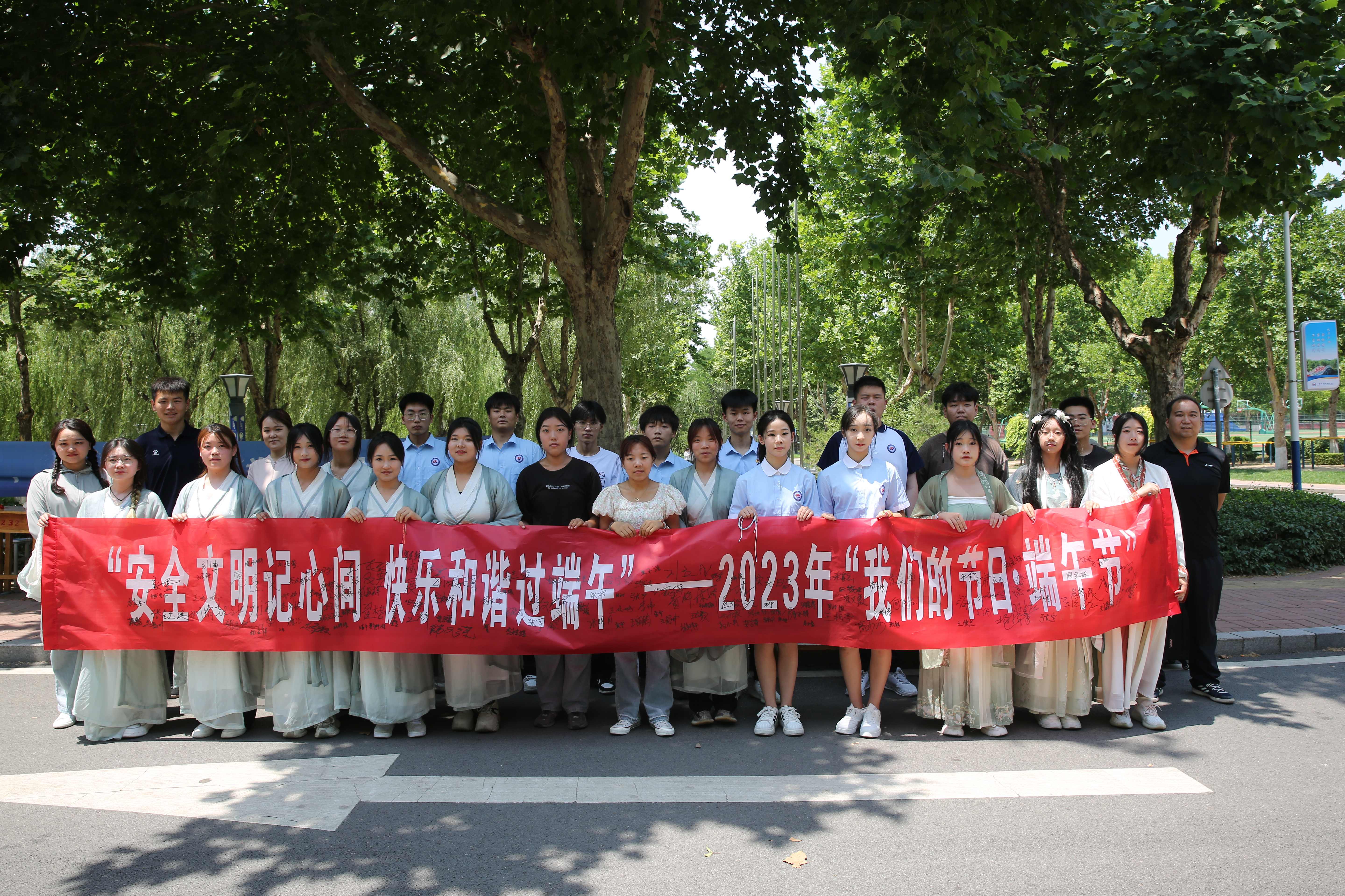 学院还举办了“安全文明记心间 快乐和谐过端午”横幅签名活动,向同学发放《文明过节倡议书》,倡议“思善贤、爱中国”,感受古圣先贤、家国情怀;倡议“名礼仪、感亲情”,通过节日活动感受亲情温暖;倡议“重节俭、树新风”,树立节俭、有序、文明风尚。