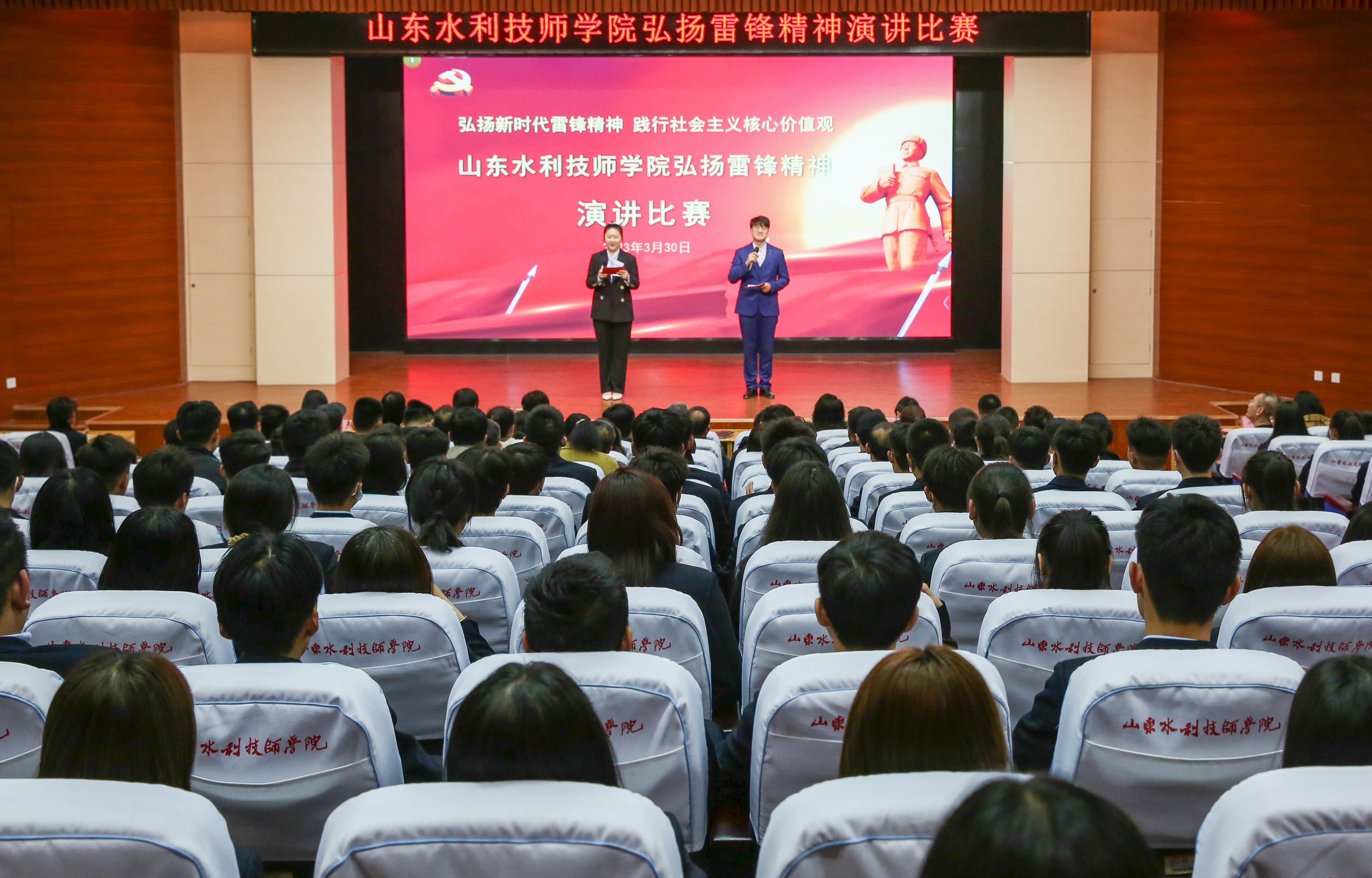 追寻雷锋脚步,我们不断前行。3月30日下午,由学院党务党支部、学务党支部主办的弘扬雷锋精神演讲比赛如期开赛。学院党委书记于福春、院长边敦典亲临现场指导。