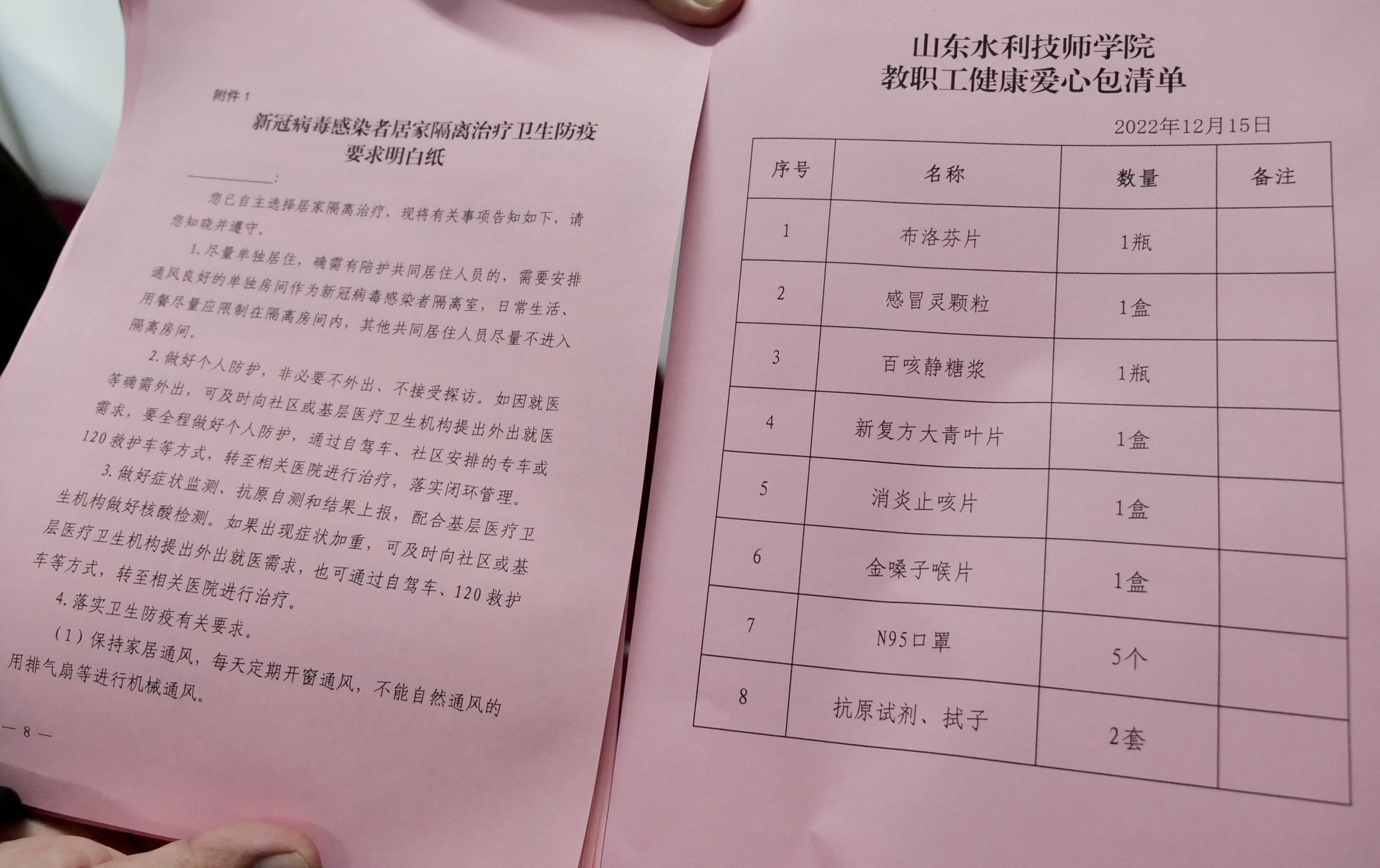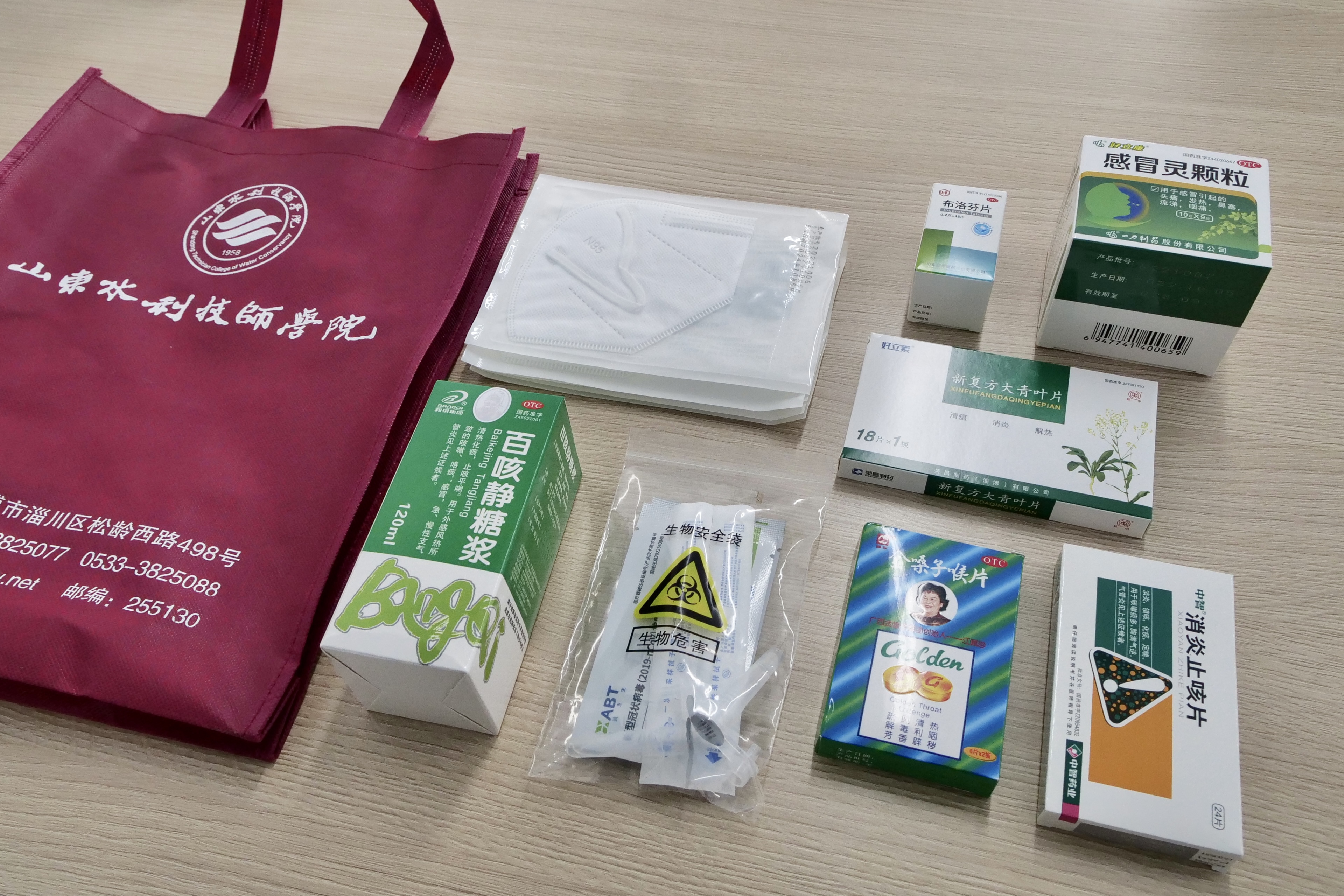 “防疫健康爱心包”内含N95口罩、抗原试剂盒、抗病毒药、退烧药、消炎药、止咳药等防疫物资和药品。一份礼包,凝聚着学院党委对教职工一片浓浓的关心爱护之情。