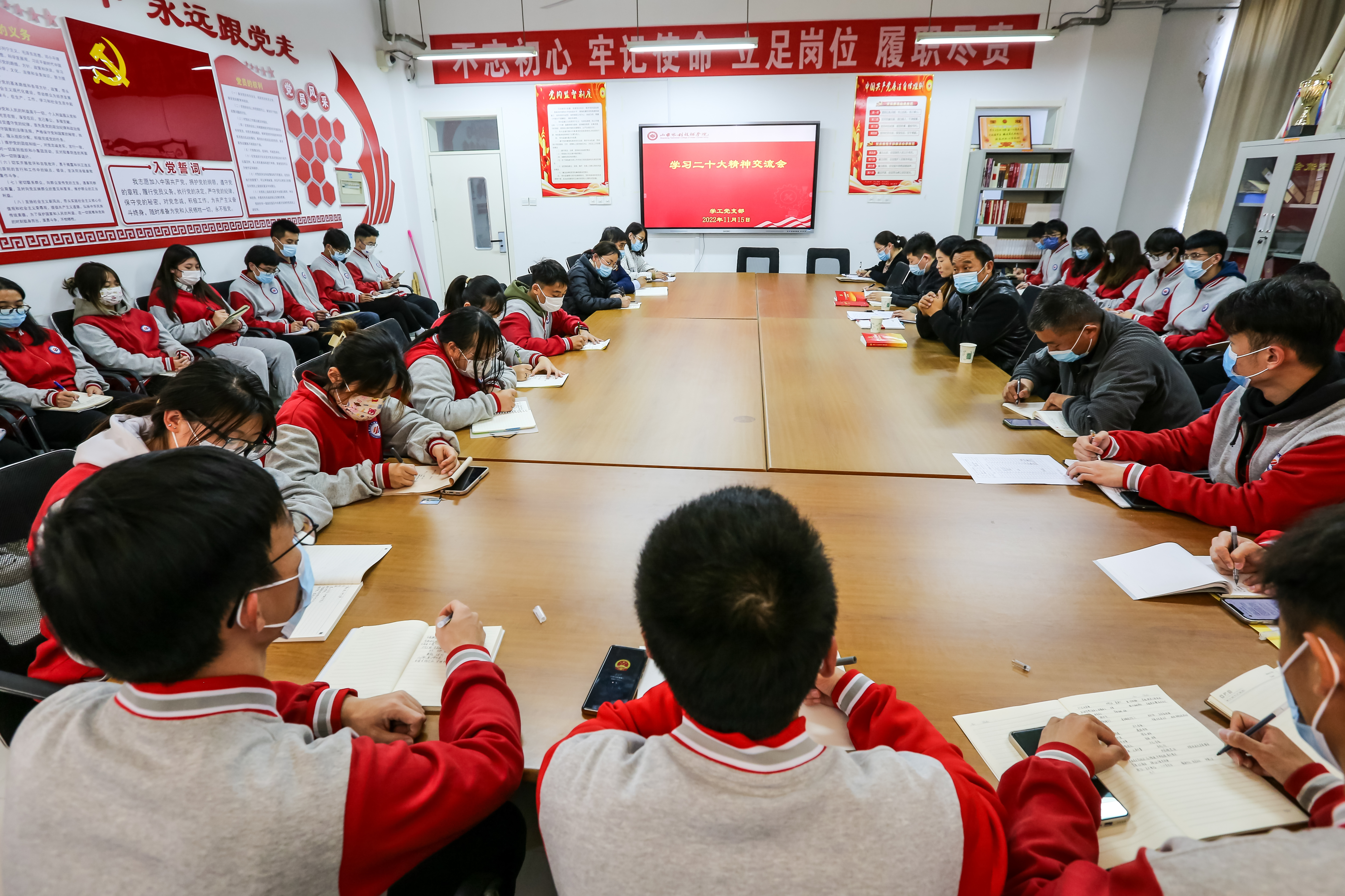 11月15日,山东水利技师学院学工党支部组织支委成员、学工队伍代表、青年学生代表,举办党的二十大报告学习交流会。
