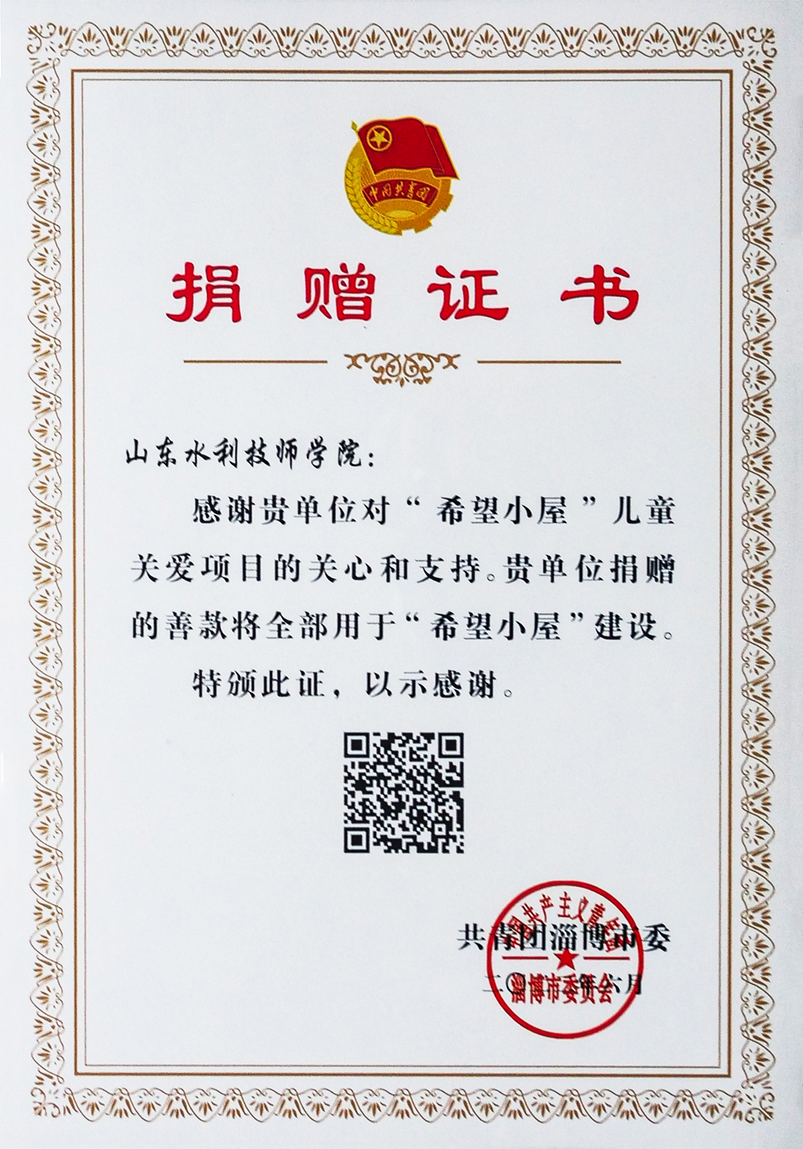 赠人玫瑰,手有余香;奉献爱心,托起希望。近日,山东水利技师学院收到共青团淄博市委发来的捐赠证书和感谢信,对之前学院捐资支持“希望小屋”项目的善举,表示肯定和感谢。
