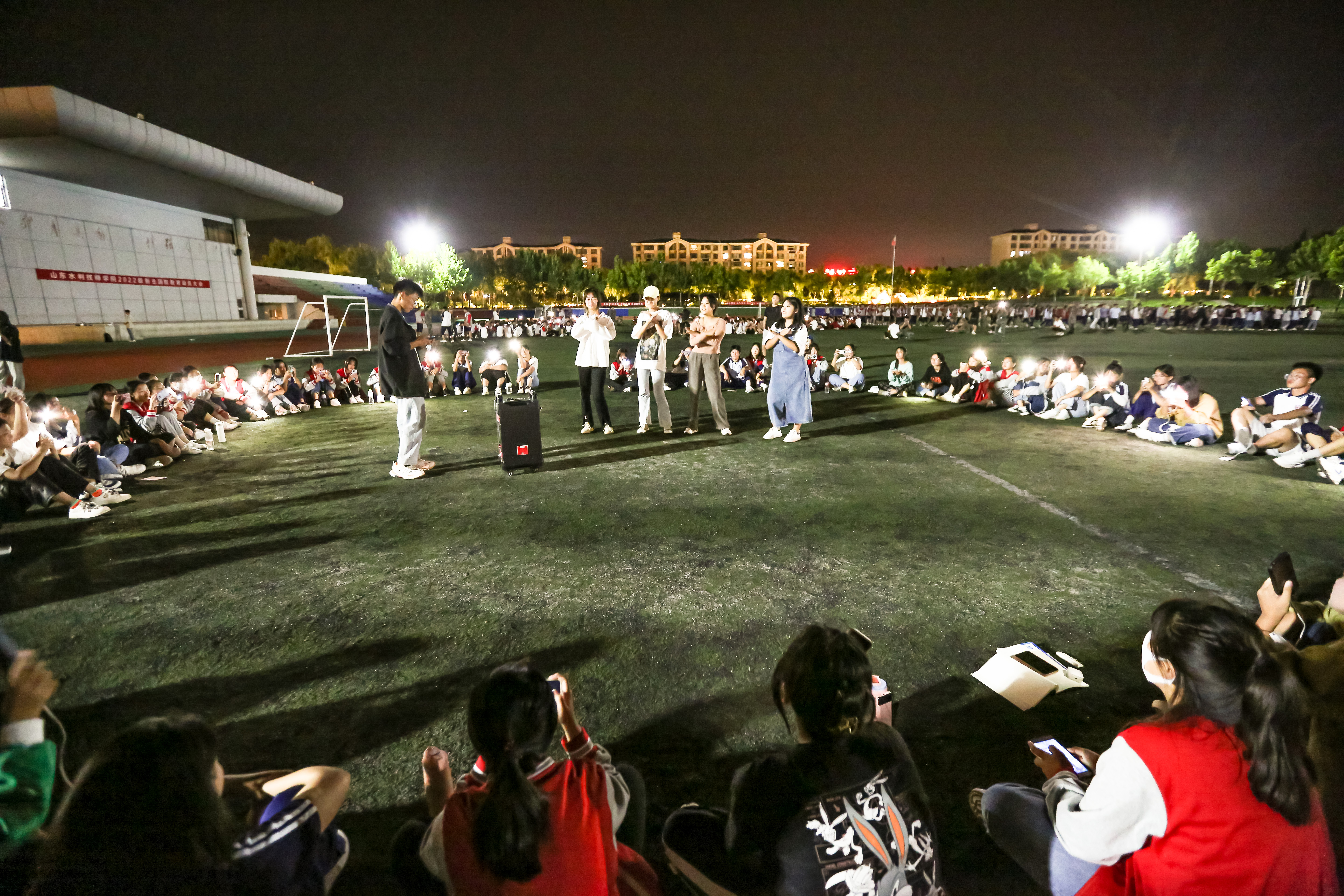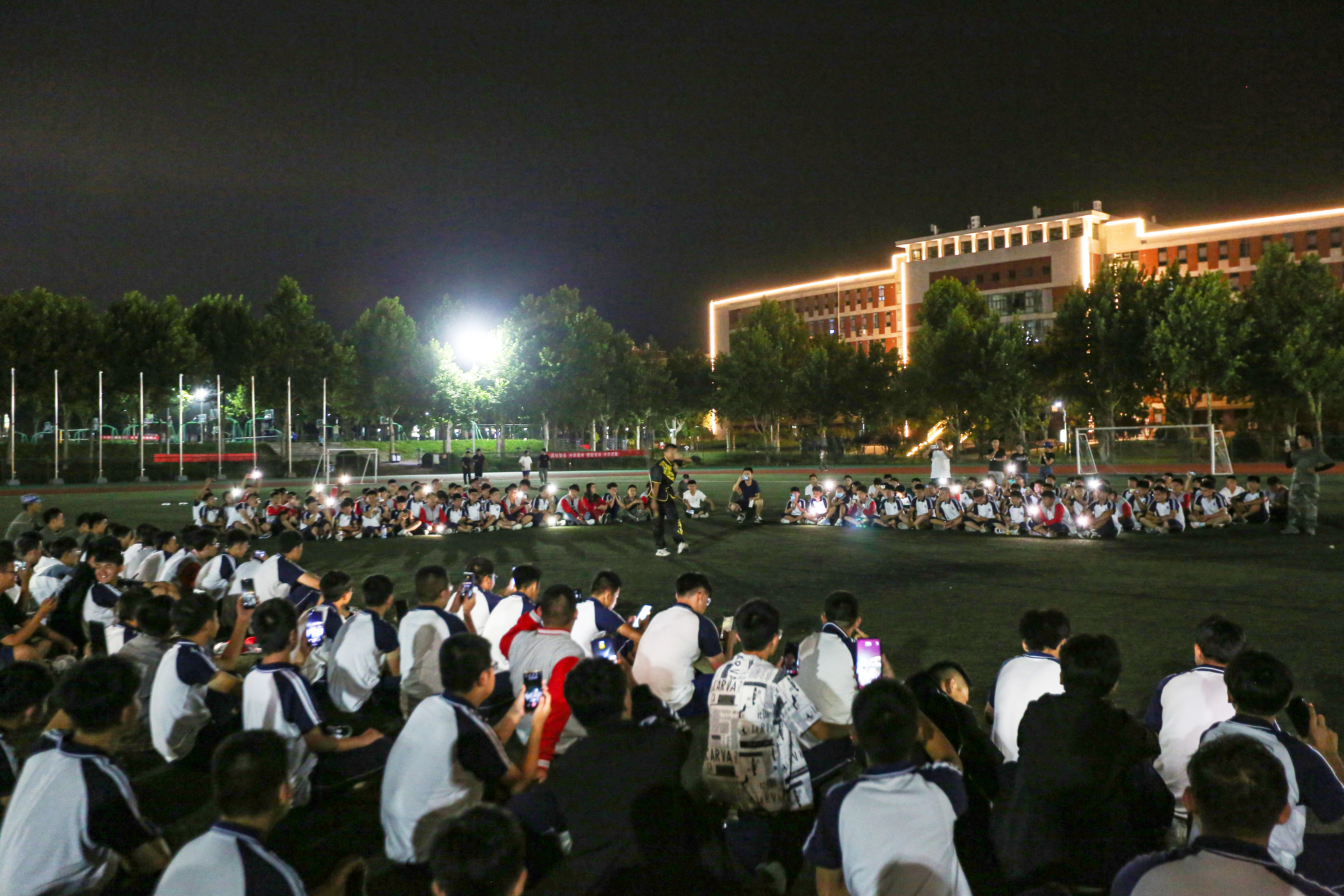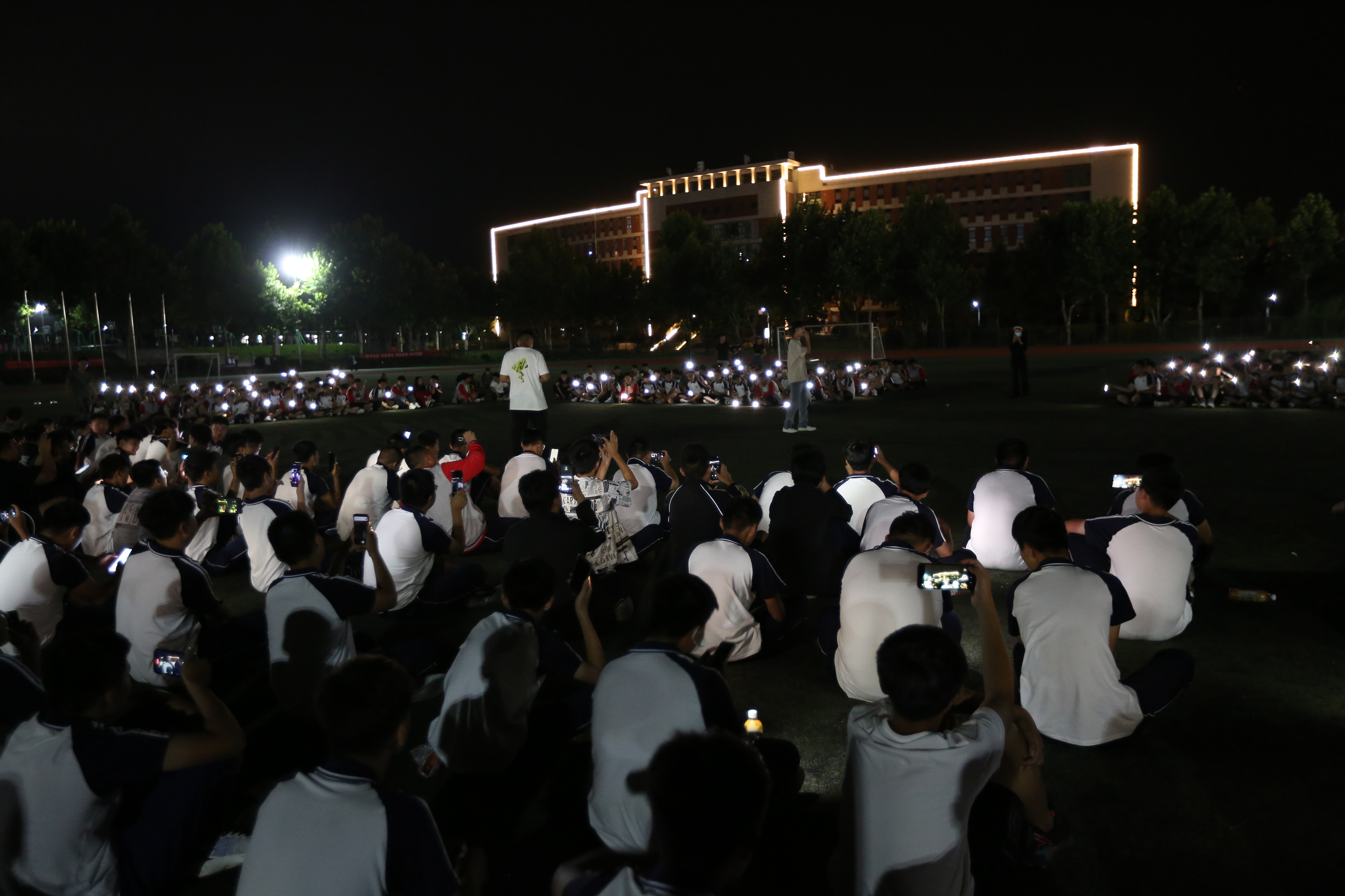 军训期间,萌新们顶着烈日和风雨在田径场上苦练身、磨意志、心昂扬几天功夫他们就结实健壮了夜幕笼罩时忙碌一天的萌新们在干什么呢在灯光的辉映下他们的活力、潜力、魅力也一同绽放