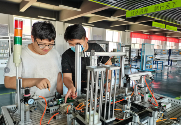 终于,经师生历时18天的努力,两台自动化生产线设备旧貌焕新颜,增加了机械装置、电气管路连接及传感装置的安装调试,可完成机械手控制、物料传输、定位、分捡等实训任务。而且,实训所用器材均可由学生自由装配设计后,安装到便捷网孔板上,能满足《自动化生产线设备安装与调试》课程一体化教学中器件安装、接线、编程、调试的教学需求,还可对接世赛、国赛机电一体化项目技能大赛要求。