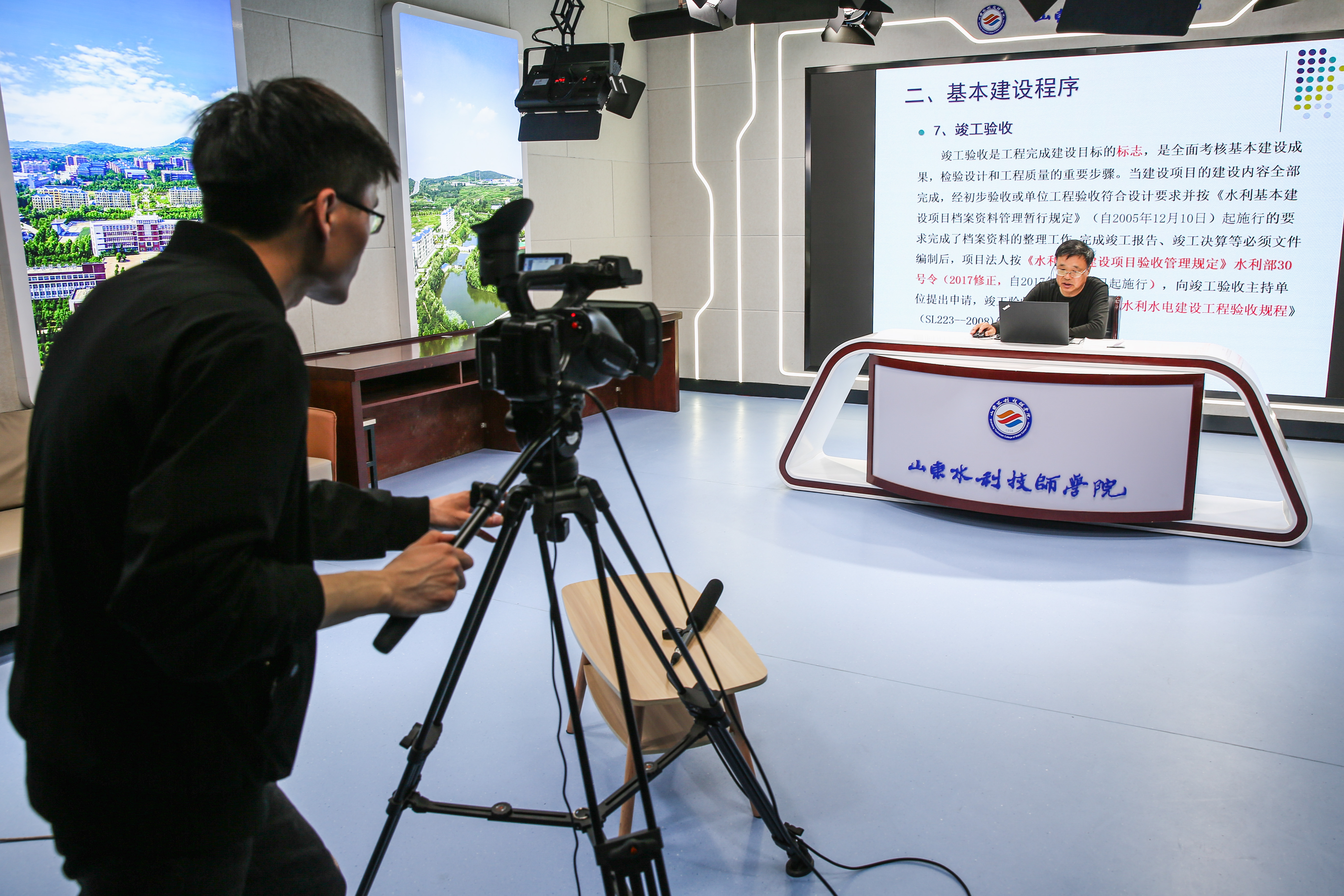 2022年4月26日,在山东水利技师学院录播室,专业教师正在通过线上教学平台,进行山东省水利行业施工企业施工管理人员直播授课培训。