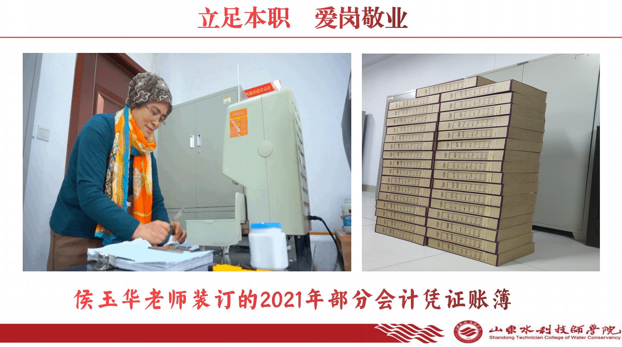 这是山东水利技师学院讲好“水院故事”暨2021年教学表彰大会的现场,学院的张昊老师,生动讲述了财务处工作人员“以一腔热血,携两袖清风,守三尺案台,献四季热情”的初心故事。其中,这个摞起来总高度两米多高的会计账簿,吸引了全校师生的目光。这些精致的会计账簿,就是财务处侯玉华老师的作品。