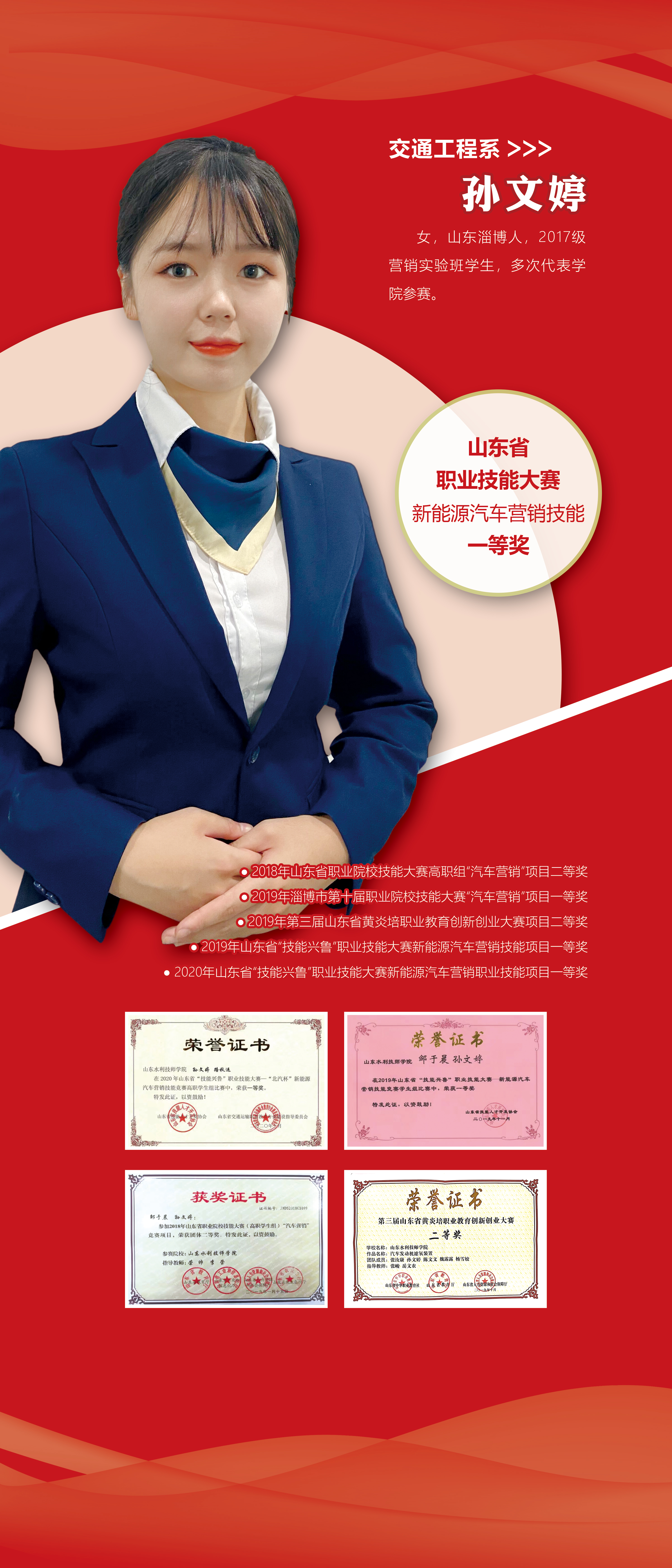 2018年山东省职业院校技能大赛高职组“汽车营销”项目二等奖2019年淄博市第十届职业院校技能大赛“汽车营销”项目一等奖2019年第三届山东省黄炎培职业教育创新创业大赛项目二等奖2019年山东省“技能兴鲁”职业技能大赛-新能源汽车营销技能项目一等奖2020年山东省“技能兴鲁”职业技能大赛“北汽杯”新能源汽车营销职业技能项目一等奖
