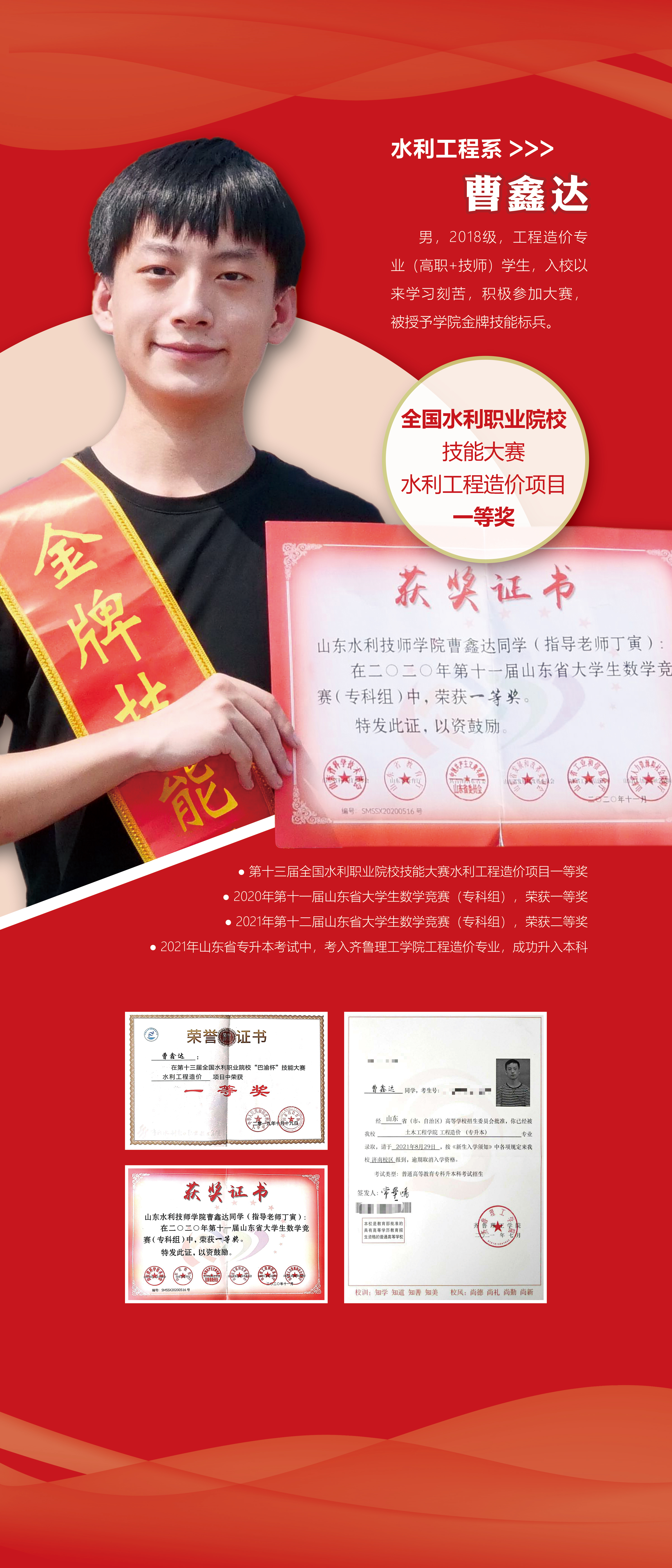 在第十三届全国水利职业院校“巴渝杯”技能大赛水利工程造价项目一等奖在2020年第十一届山东省大学生数学竞赛(专科组)中,荣获一等奖在2021年第十二届山东省大学生数学竞赛(专科组)中,荣获二等奖在2021年山东省专升本考试中,成功考入齐鲁理工学院工程造价专业,成功升入本科