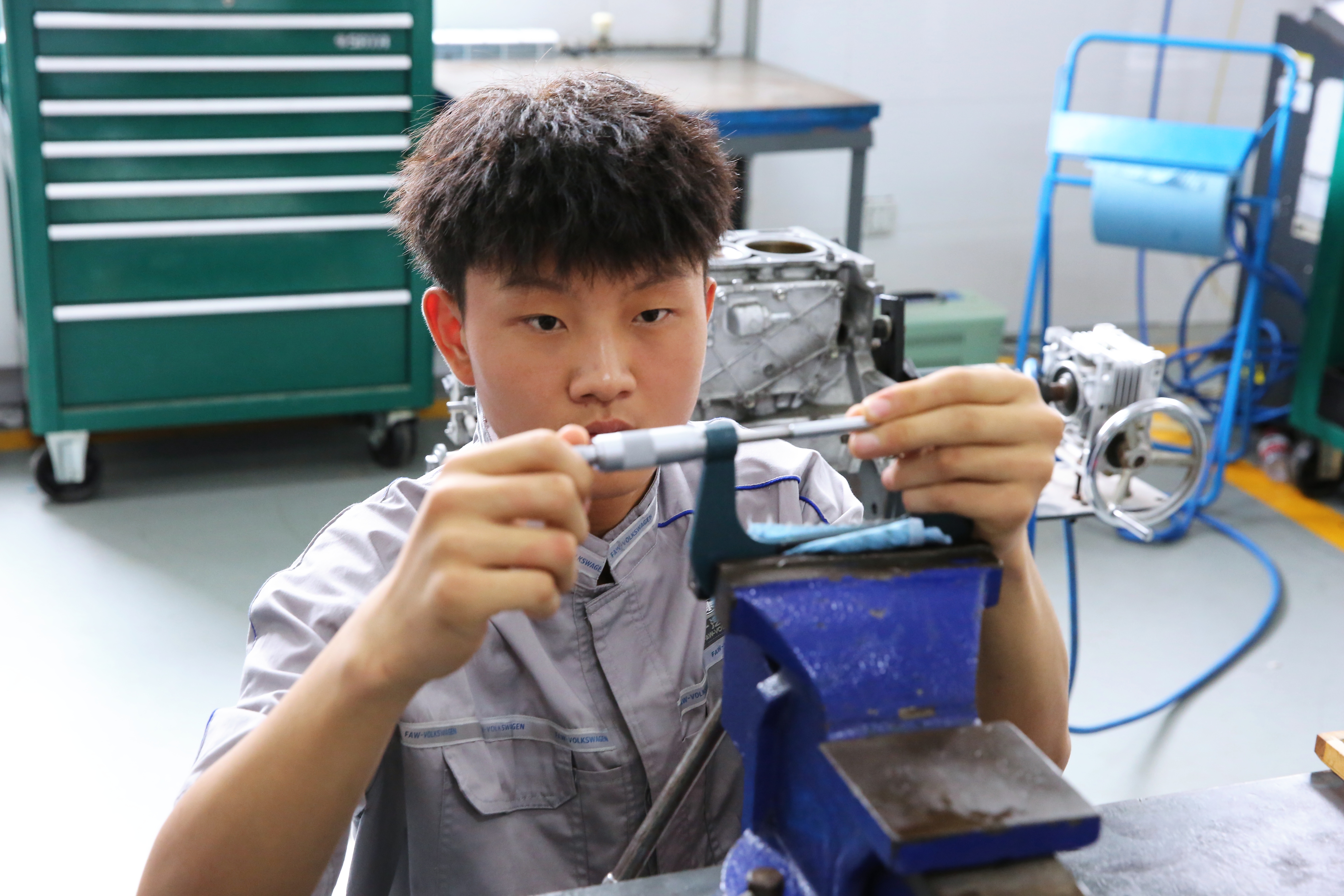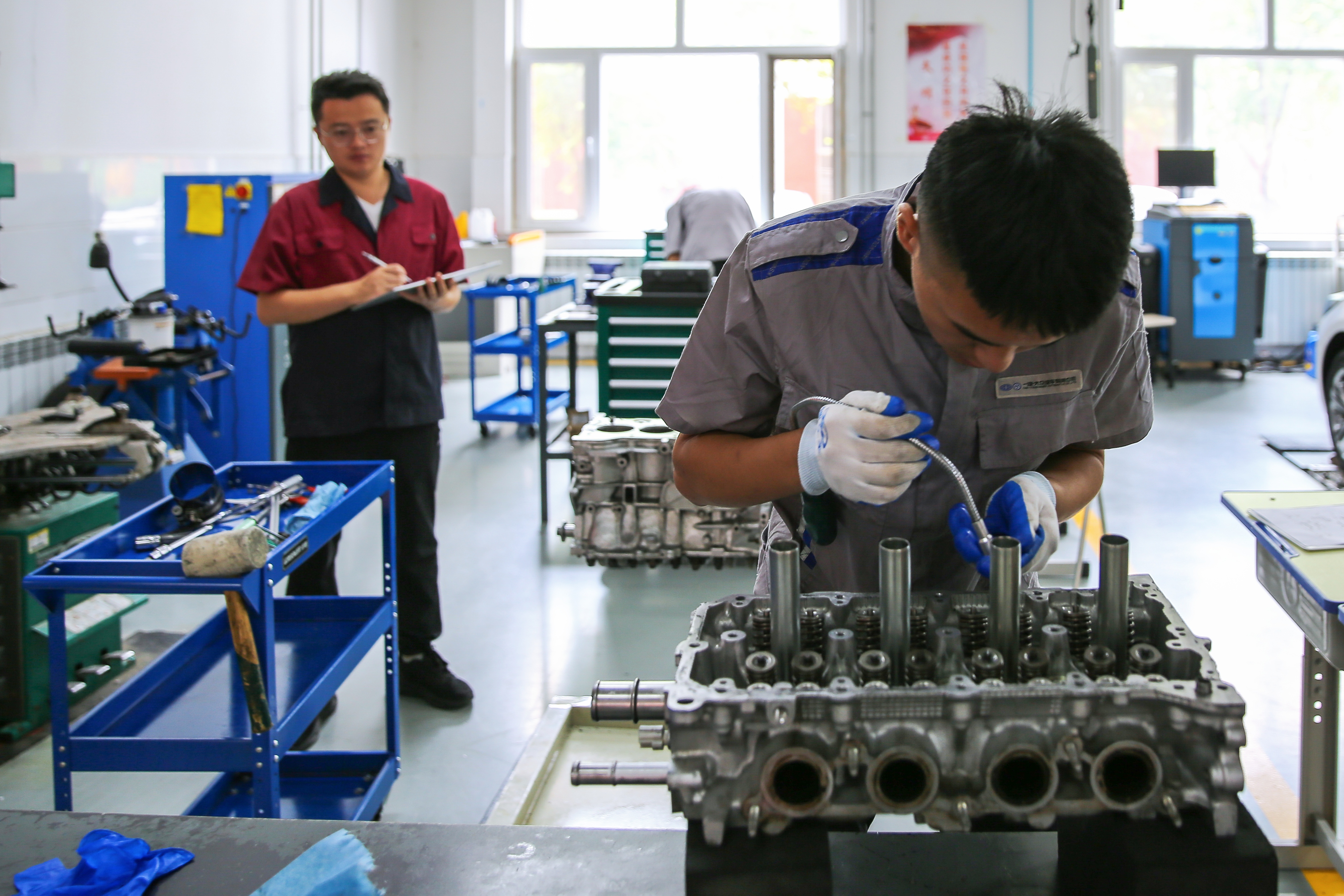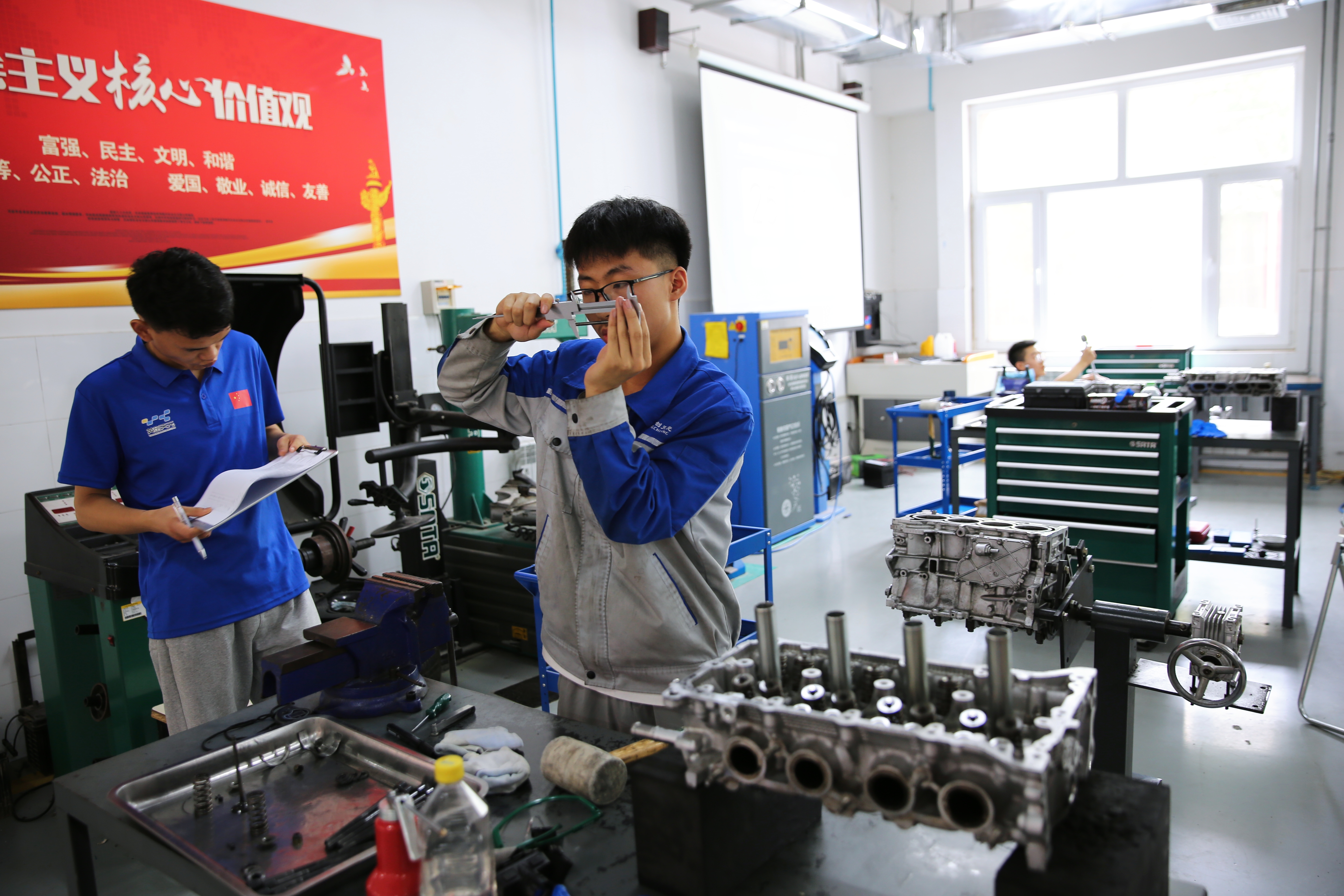 本次校内选拔赛严格按照世界技能大赛汽车技术项目的技术标准进行考核,系部3名老师现场打分,确保公平与公正。考核的主要内容,有汽缸盖的拆装与平面度测量、进排气门的拆装与测量、活塞的拆装与测量、活塞环的拆装与测量、气缸的测量等,重点考察学生的规范操作、精准测量、故障维修、安全防护等综合应用能力。