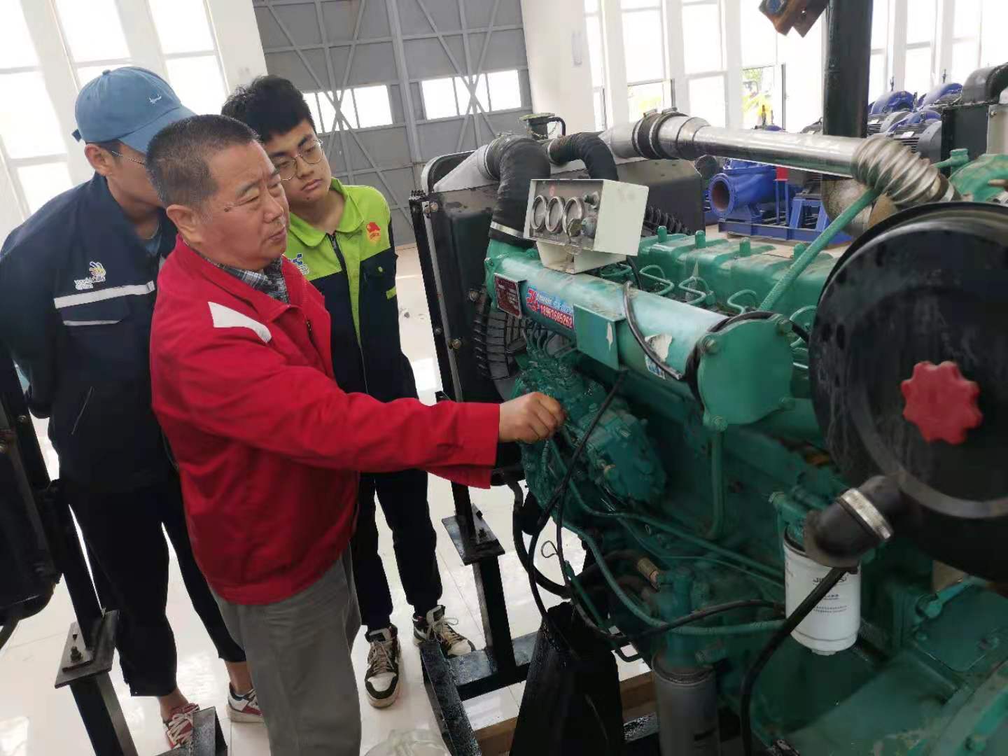 4名同学利用所学知识和技能,对23台电机水泵机组线圈阻值、相绝缘电阻、线圈对壳体阻值、电机运转状况、水泵运转情况进行检查,并对10台柴油机泵组、10台单缸柴油机真空泵组,完成了更换机油、机滤、空滤、燃滤,添加防冻液,检查连接管路和发动机运行启动测试。