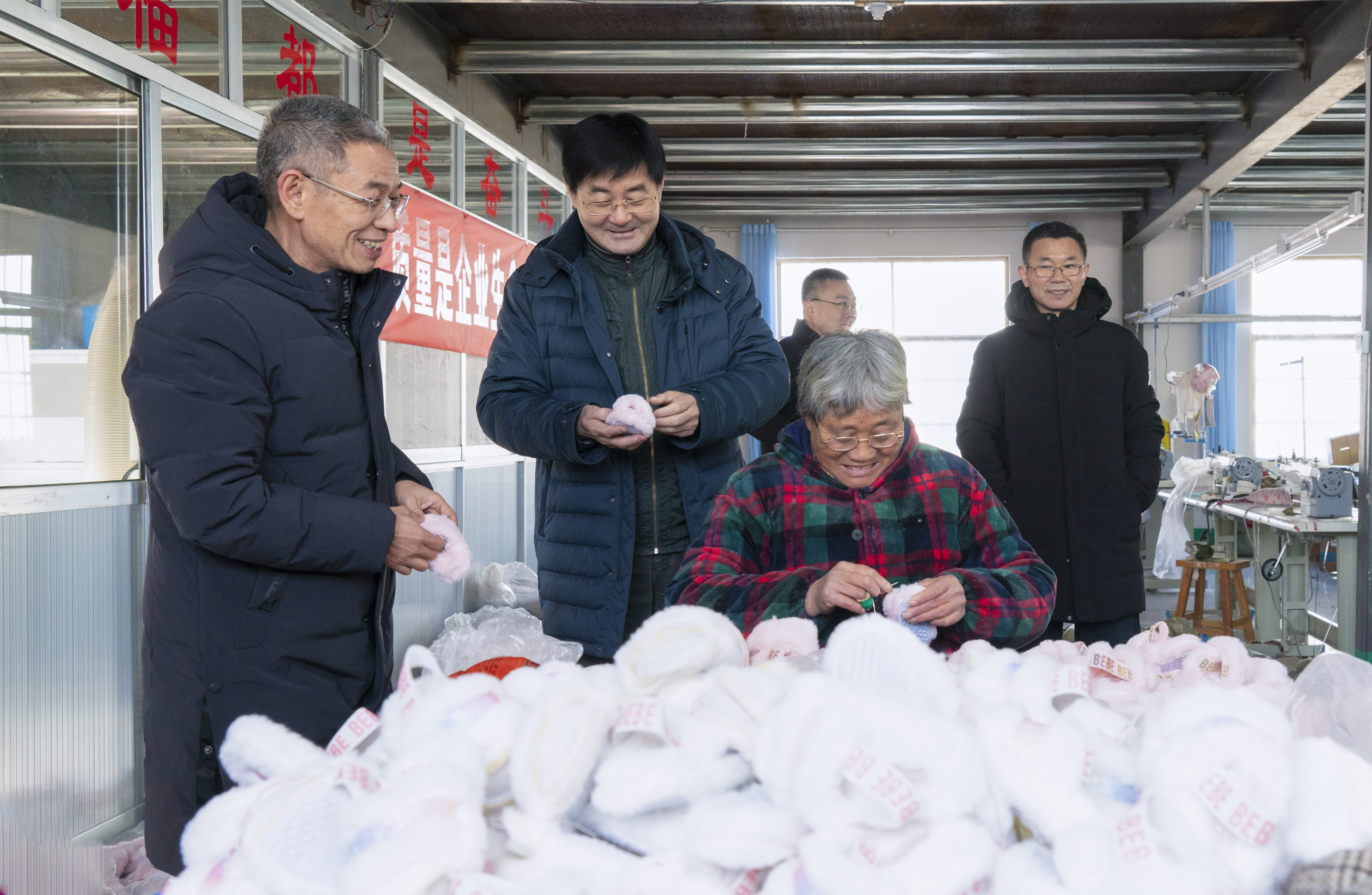 我们参观了宸洋工艺品车间,一排排电动缝纫机摆放的井然有序。外面天寒地冻,车间内干劲十足。企业实行的是计件工资,上班时间灵活。这些员工都是村里的妇女,她们想象不到自己既不耽误农活,空闲时还能挣工资。车间不大,是第一书记们助力扶贫、振兴乡村的工作缩影。一个车间,简单而不凡,展示的是第一书记们的奉献精神、是水利人的忠诚情怀,心心念念为扶贫助力,实实在在为百姓做事。