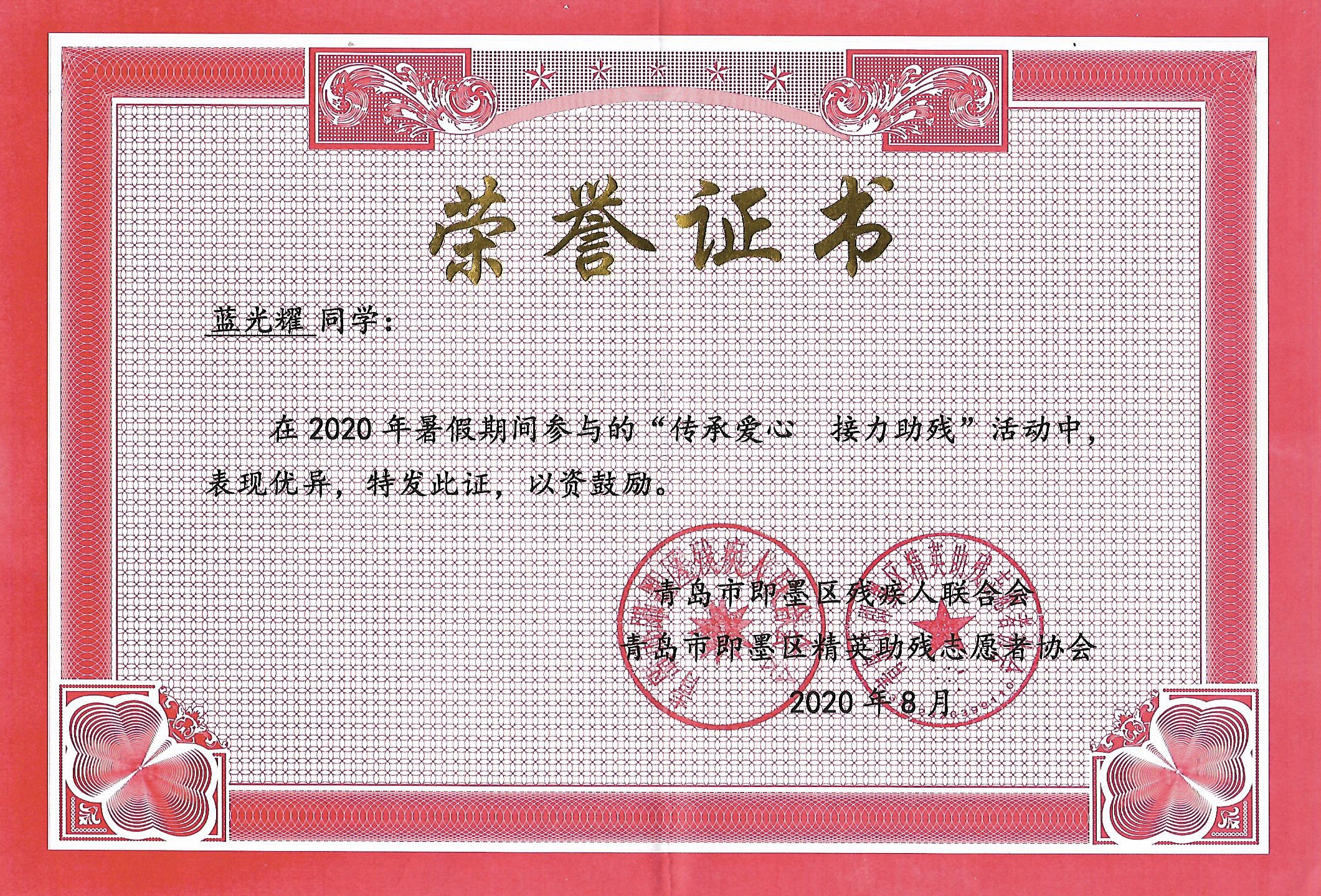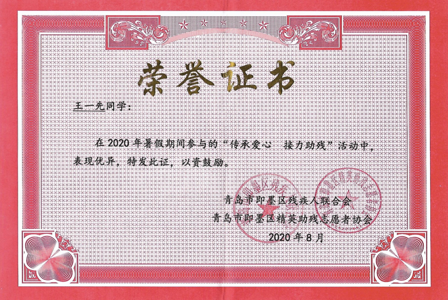 “王爷爷是一名退伍老兵,老伴儿患有精神疾病,生活一直很艰难。家里的儿子如今虽学业有成了,但是怕媳妇嫌弃患病的老母亲,便离开家独自去了城里生活。这可苦了王爷爷老两口。到王爷爷家的时候,他满怀笑容地迎接着我们,看到他脸上洋溢着幸福的笑容,我们心里很不是滋味。在陪他聊天的过程中,我们明显能感受到他乐观的生活态度。生活在新时代的他们在不愁温饱,只是少了子女的陪伴,缺乏亲情呵护。老人们想要的不多,只是希望子女能够多一点时间陪伴他们,能常回家看看,陪父亲下下棋、喝喝茶,陪母亲聊聊天、打打牌,仅此而已。随着时间的推移,我们和王爷爷越聊越开心,心里的沉重也减轻了许多。”王一先介绍说。活动结束后,青岛市即墨区残疾人联合会和青岛市即墨区精英助残志愿者协会分别为王一先和蓝光耀颁发了爱心助残荣誉证书,但都被他们珍藏起来,没有告诉任何师生。