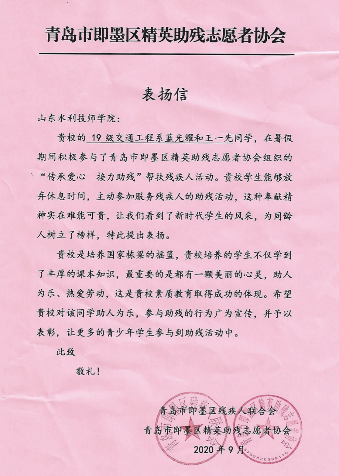 近日,一封由青岛市即墨区残疾人联合会和青岛市即墨区精英助残志愿者协会共同发出的表扬信,寄到山东水利技师学院,学院交通工程系学生王一先和蓝光耀利用暑假“传承爱心 接力助残”的爱心事迹,才被广大师生所知悉,从而也为近日来连续在国家和省各级技能竞赛中屡获佳绩的交通工程系,再报喜讯,再立新功。