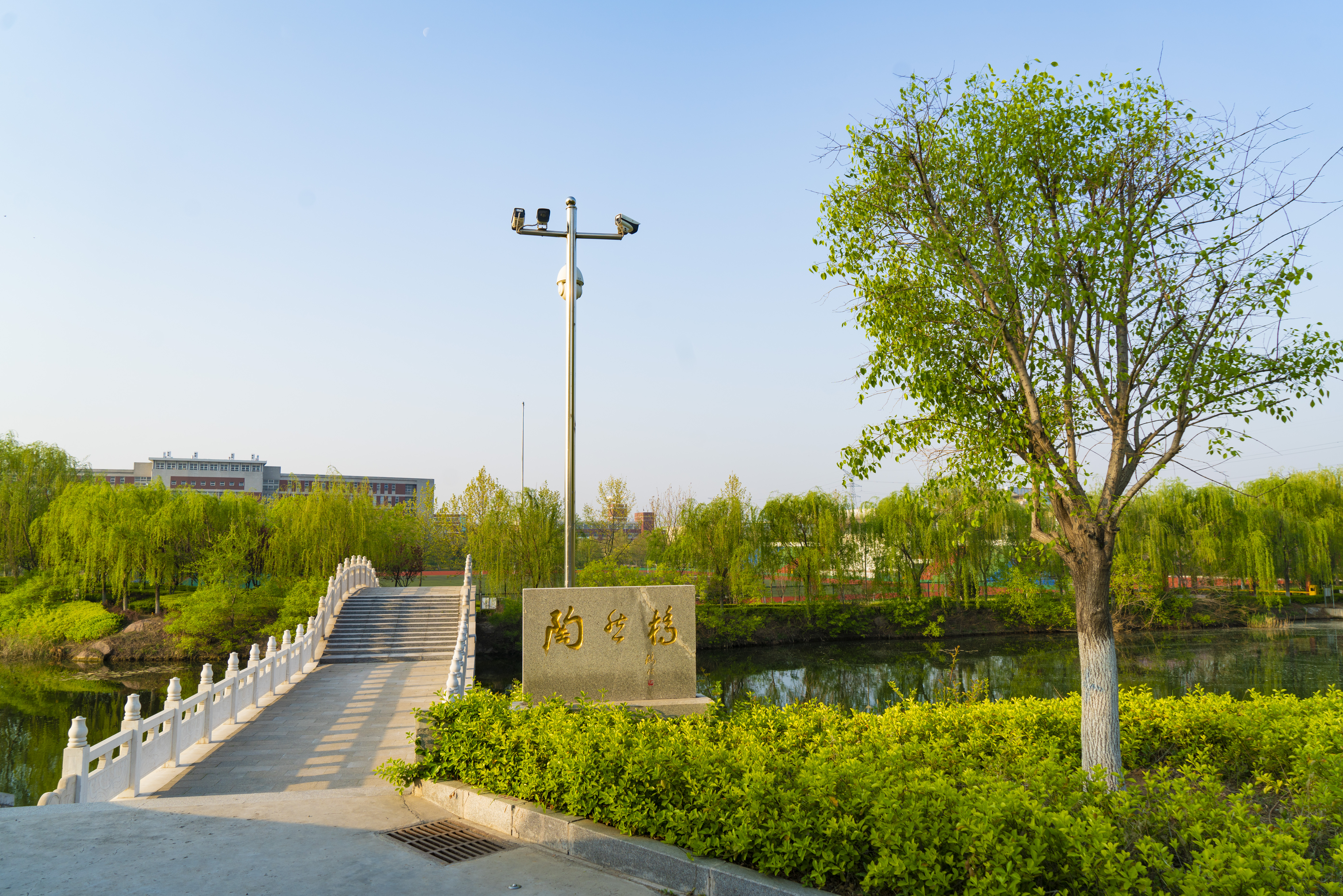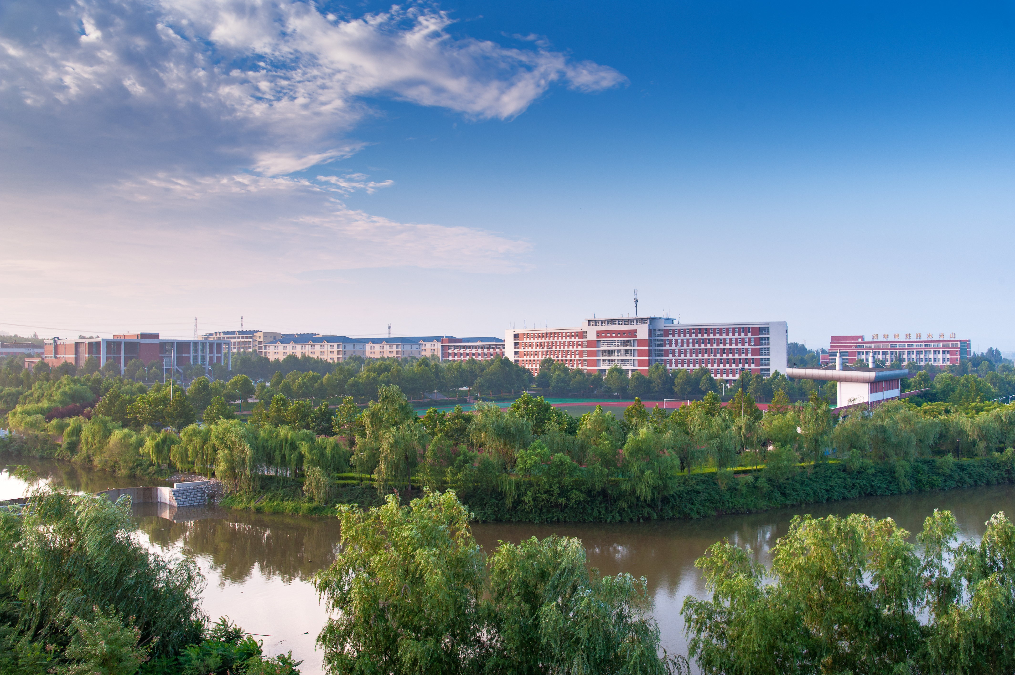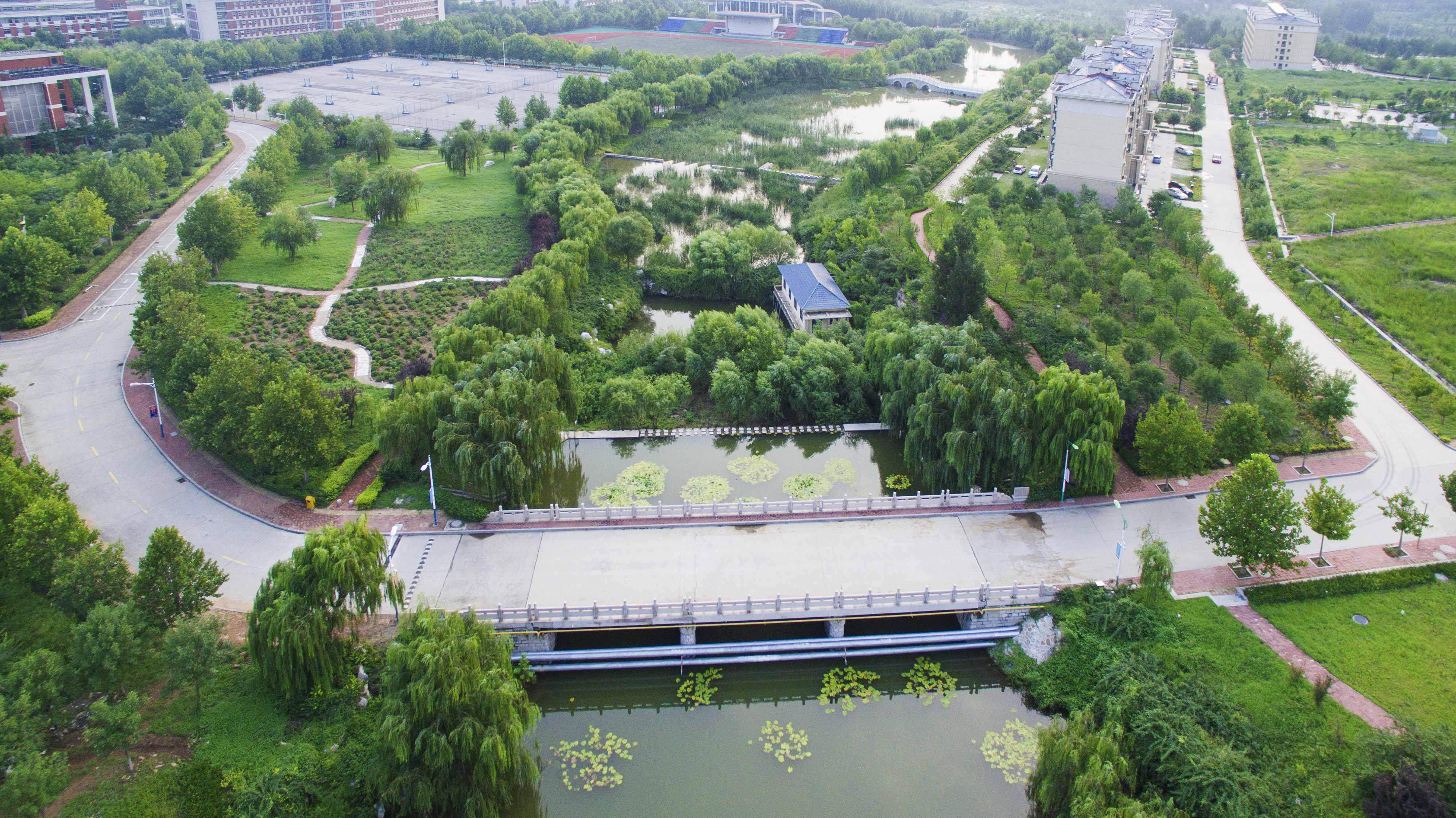 校园有条河,依萌山,涓涓细流不断,是孝妇河的支脉,名为萌源河。河水潺缓,河道宽阔,流经校园东西,是一条贯通的水系,舒展柔活,润泽一方。学院水利工程专业借势设坝,截流蓄洪,分别建了四个高低不同的水坝,砼重力坝、迷宫堰、三连单曲拱坝和浆砌石重力坝,还有两座泵站房和三角量水堰、浆砌石水渠、小渡槽,成了系统的萌源河小流域水利工程。河道呈阶梯状排列,东高西低流势,水坝储水丰富,成为实体水工建筑物教学基地。