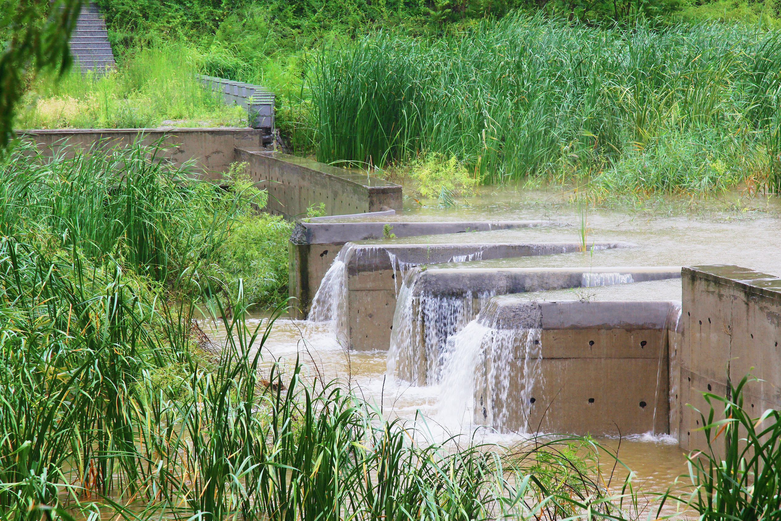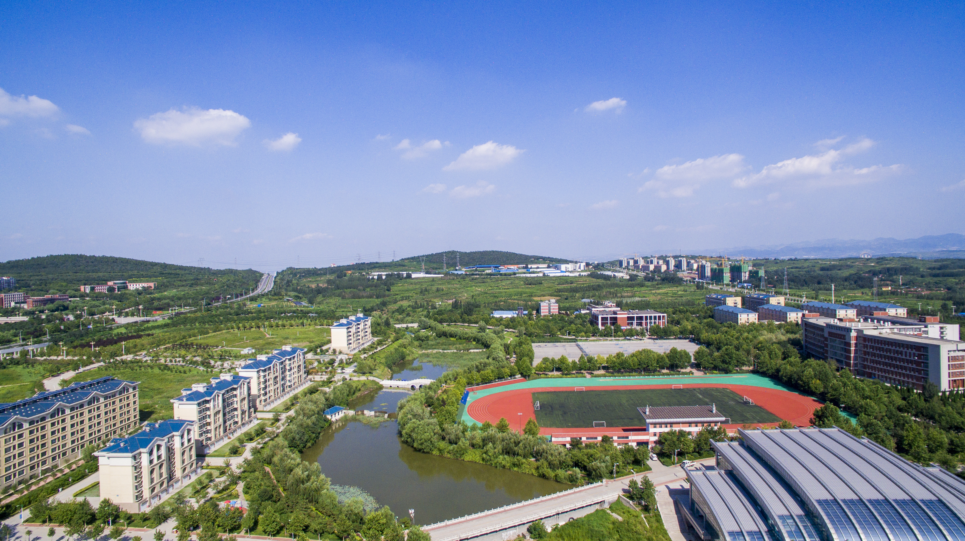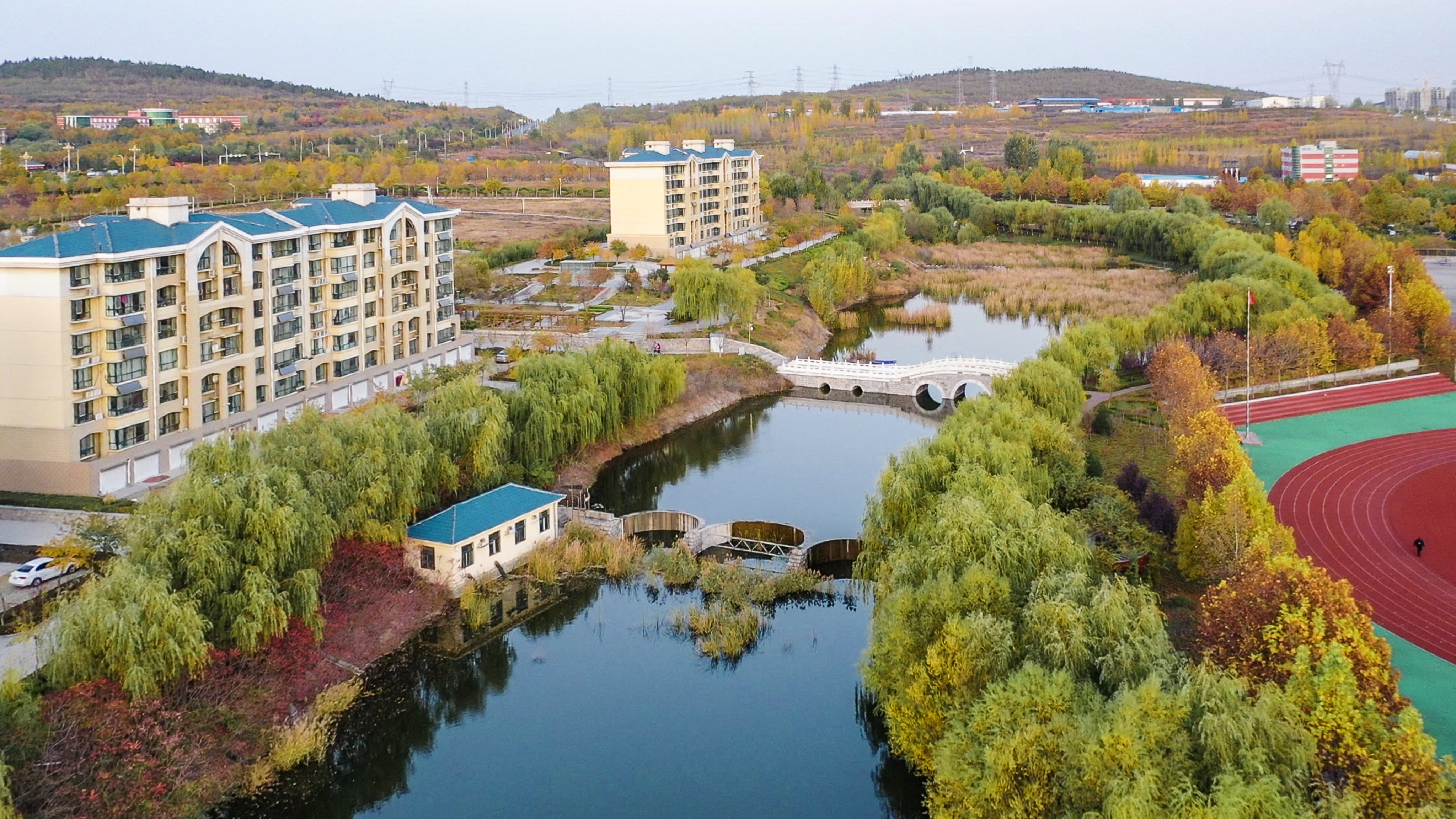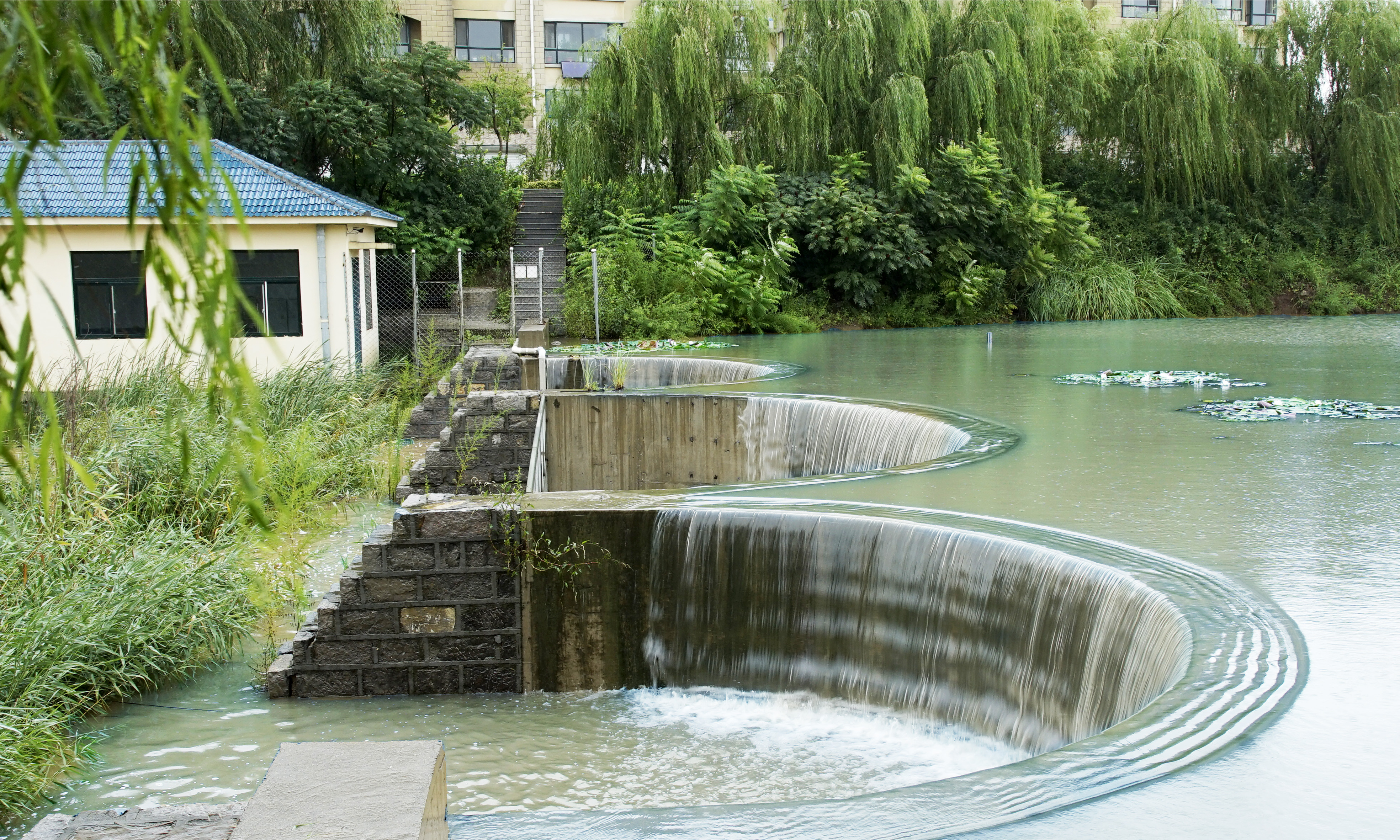 校园有条河,依萌山,涓涓细流不断,是孝妇河的支脉,名为萌源河。河水潺缓,河道宽阔,流经校园东西,是一条贯通的水系,舒展柔活,润泽一方。学院水利工程专业借势设坝,截流蓄洪,分别建了四个高低不同的水坝,砼重力坝、迷宫堰、三连单曲拱坝和浆砌石重力坝,还有两座泵站房和三角量水堰、浆砌石水渠、小渡槽,成了系统的萌源河小流域水利工程。河道呈阶梯状排列,东高西低流势,水坝储水丰富,成为实体水工建筑物教学基地。