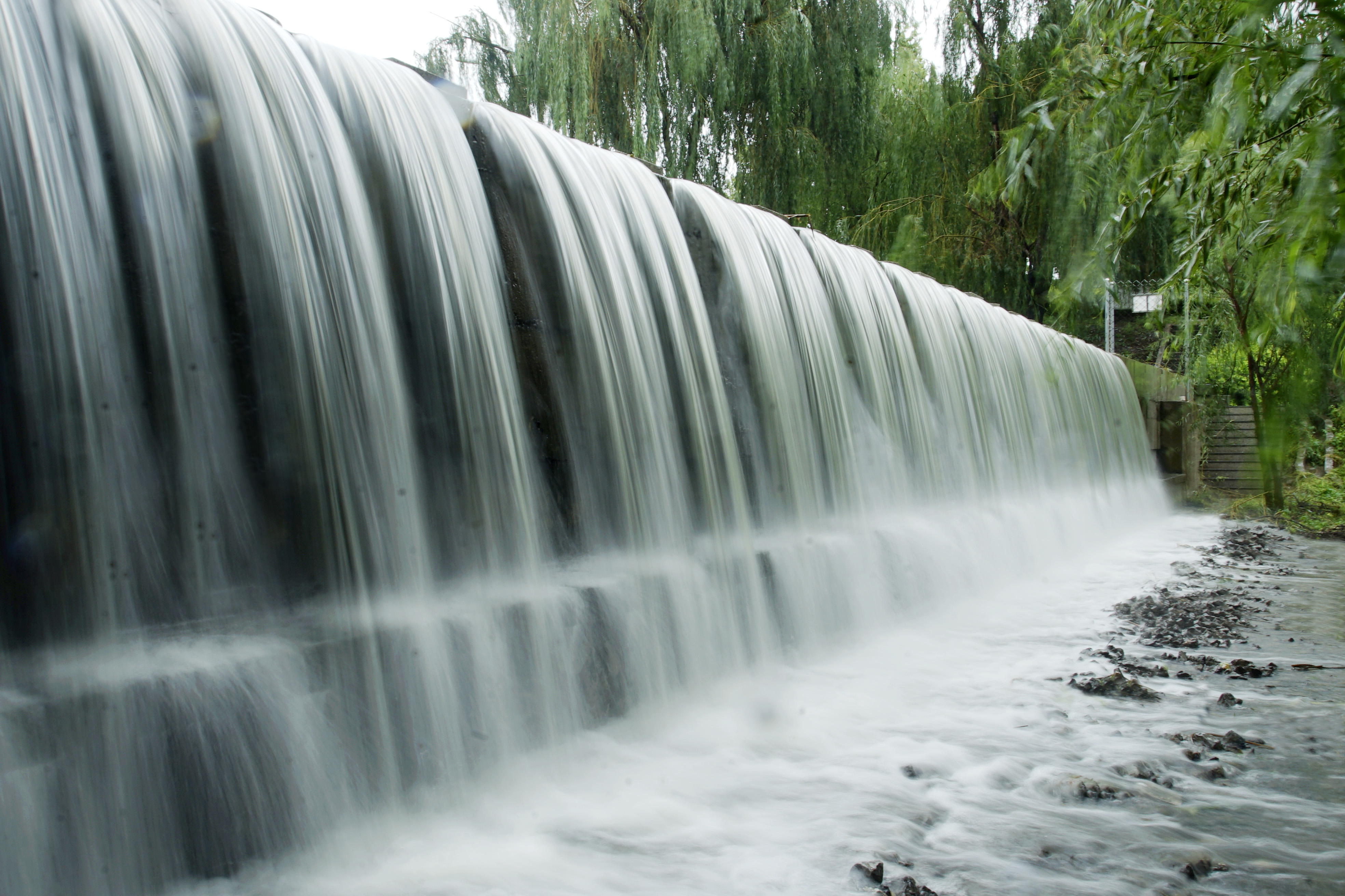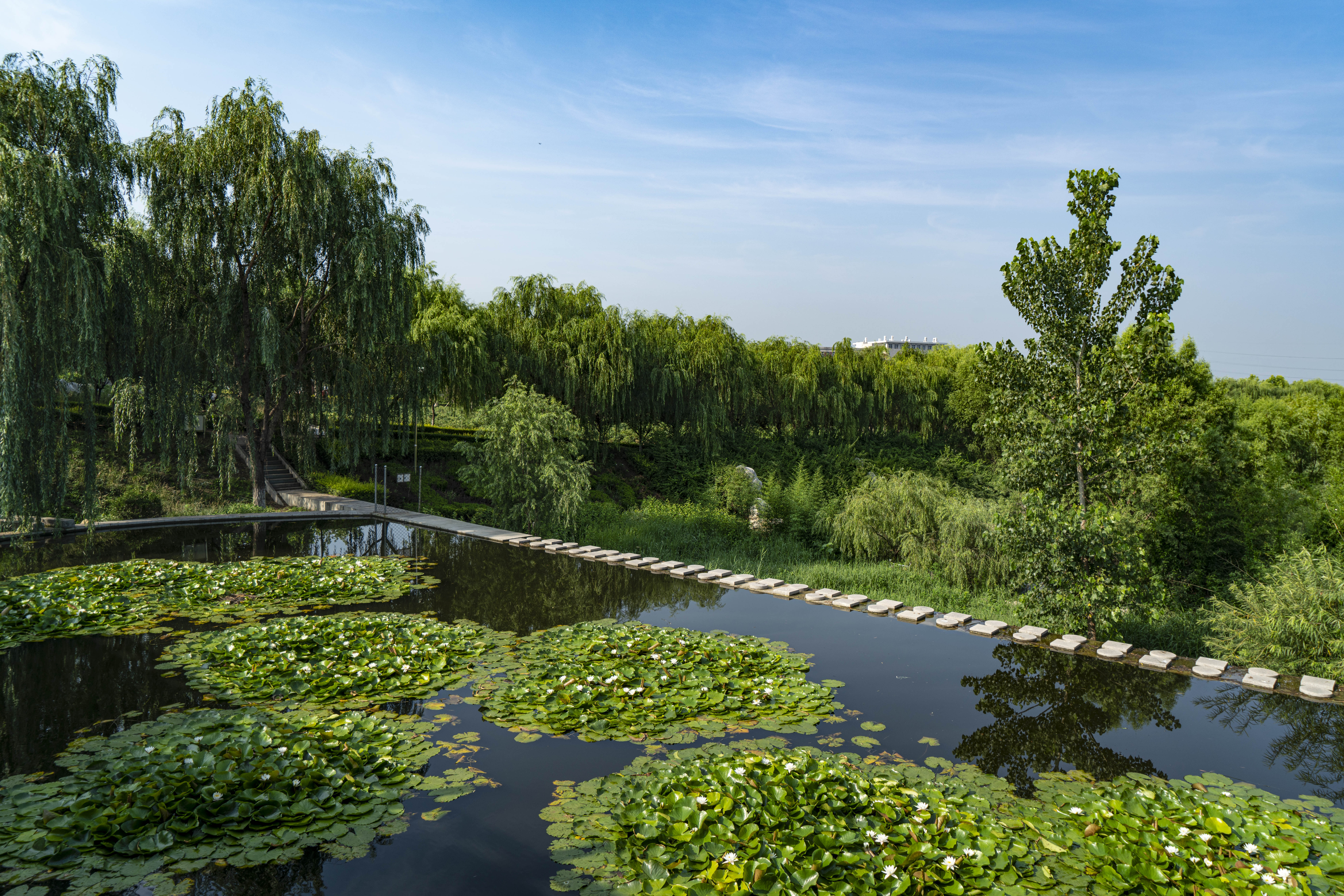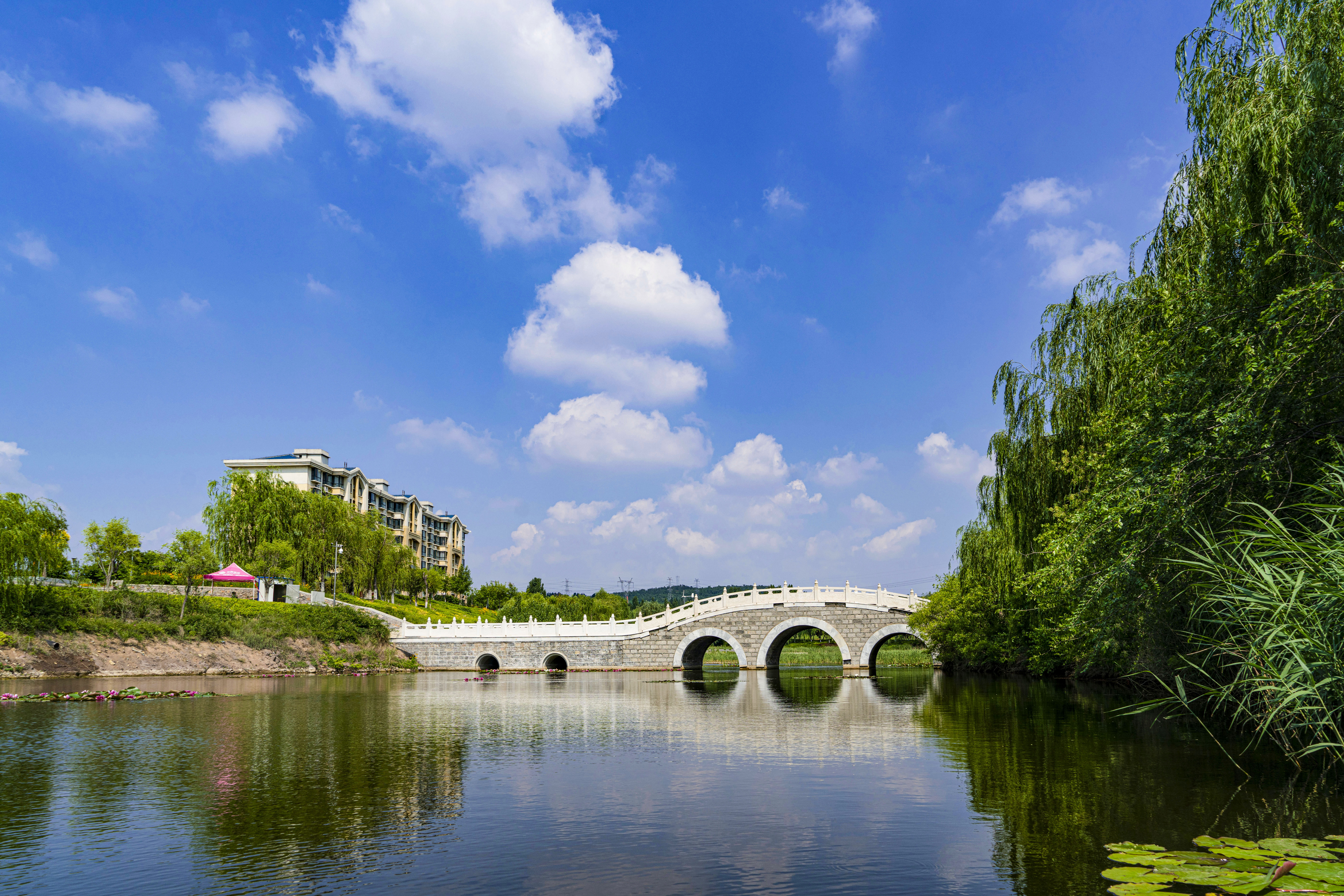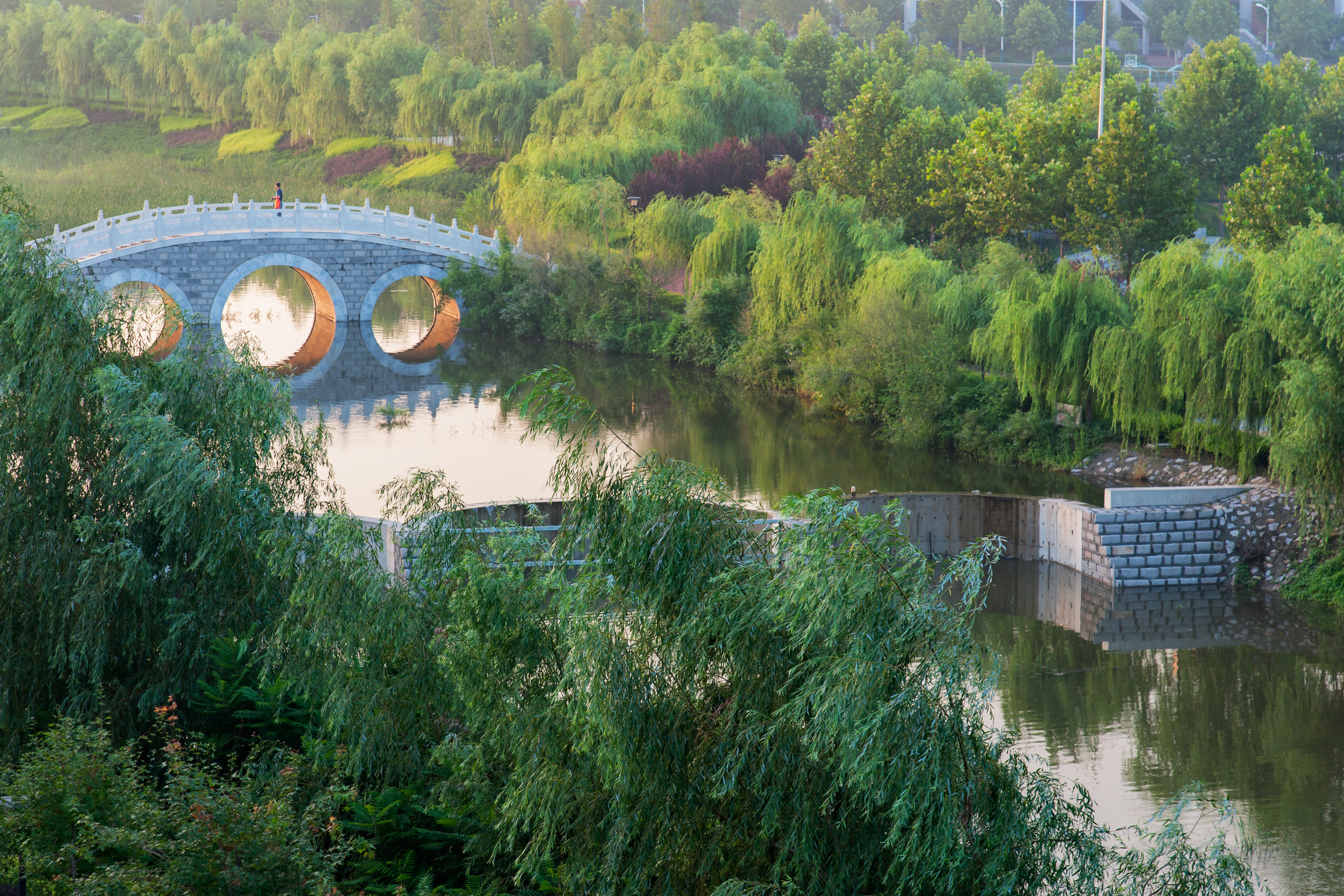 河上有三座白色大理石桥,同济桥、陶然桥和观澜桥,取自同舟共济、陶然忘机和信步观澜之意,这也正是人生三大境界。三座桥把河分为三段,上游同济桥以东,地势高,林地杂草丛生,苍茫神秘,隐蔽了河线,是野鸭,鸊鹈,水鸡,水鸟的天堂,悠游而居。中游从同济桥开始,一直到陶然桥,水植丰满,也是水坝泵站集中地。再往下就是宽阔如镜的水面,一座蓝顶黄墙的水泵房,依水而建,添人文景致几许。到观澜桥处为下游,水面极宽,河岸树木茂郁,呈现出欧派油画里水岸茂林的旖旎风光,有如多瑙河之波岸。
