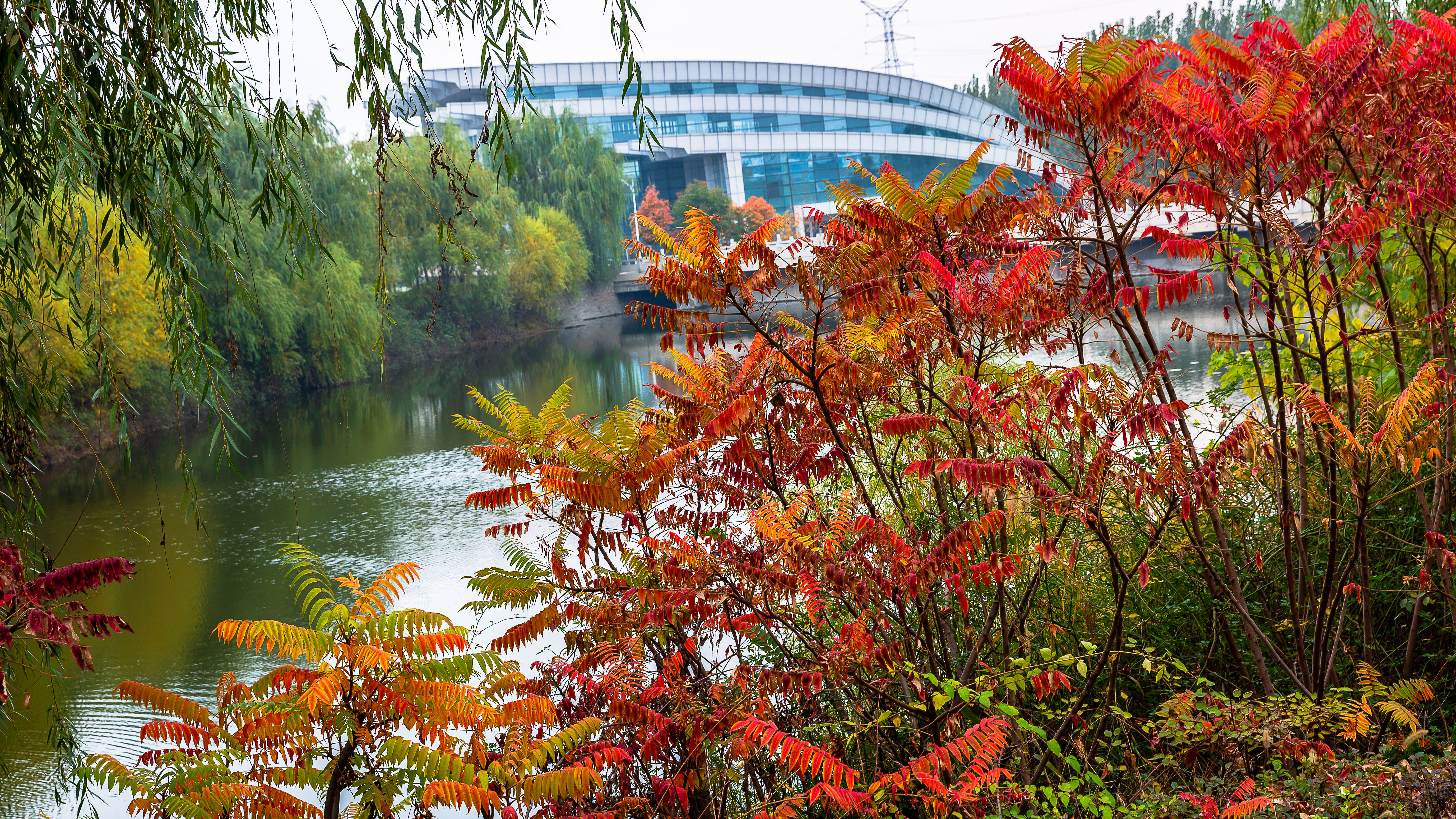 沿南岸行走,左侧是一排紫叶李树,春来花满径,还有几棵高大的银杏树,秋日黄灿灿。树边花草丰盛,牡丹园、月季园、金鸡菊地和矮牵牛花地等连成片,是真正的五彩缤纷地。右侧临河垂柳依依,柳岸细道绵长,柳荫蔽日。一路行走面河,河内蓄水宽,水坝处可听闻流水喧响。水面拥满绿植,水生柳树,串根入河,茂盛生长,更茂盛铺张的是芦苇,蒹葭苍苍,占满水面,像一方水军,强行霸居。还有浮萍睡莲,田田平铺,朵朵竞开,红粉净白点缀。北岸是淡黄墙湖蓝顶的教工宿舍,沿河排列开,地势高,视野开敞,在居室内临窗即可俯瞰河及对岸校区,可谓窗含一川千秋水。