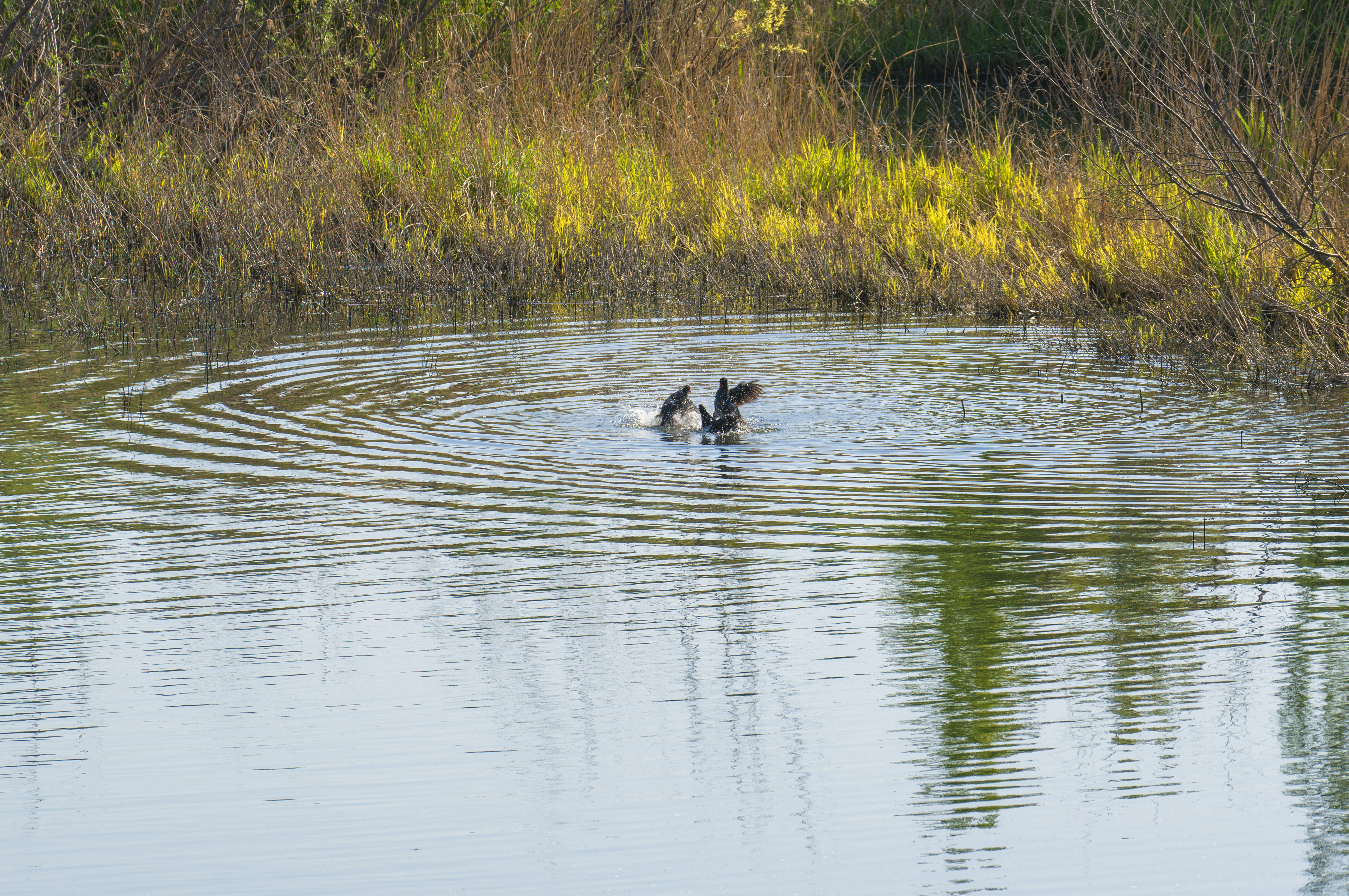 冬季冰雪覆盖,坚硬的苇杆在河中依然顶着繁茂的苇花,苍白柔软,瑟瑟而动。北风萧肃,呼啸而过。阳光依然暖意地罩在河面,水下有喧动等待冰裂之声。
