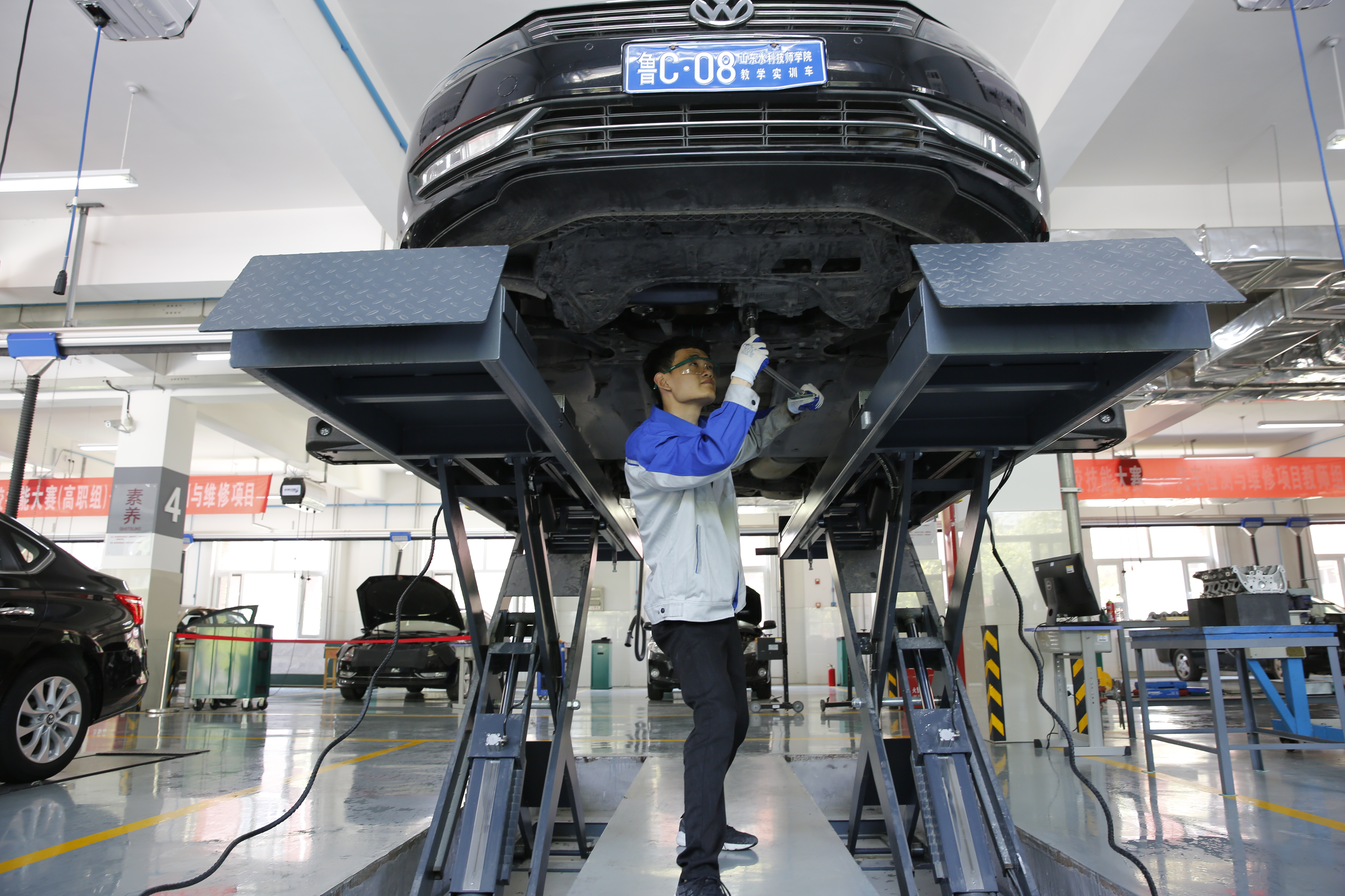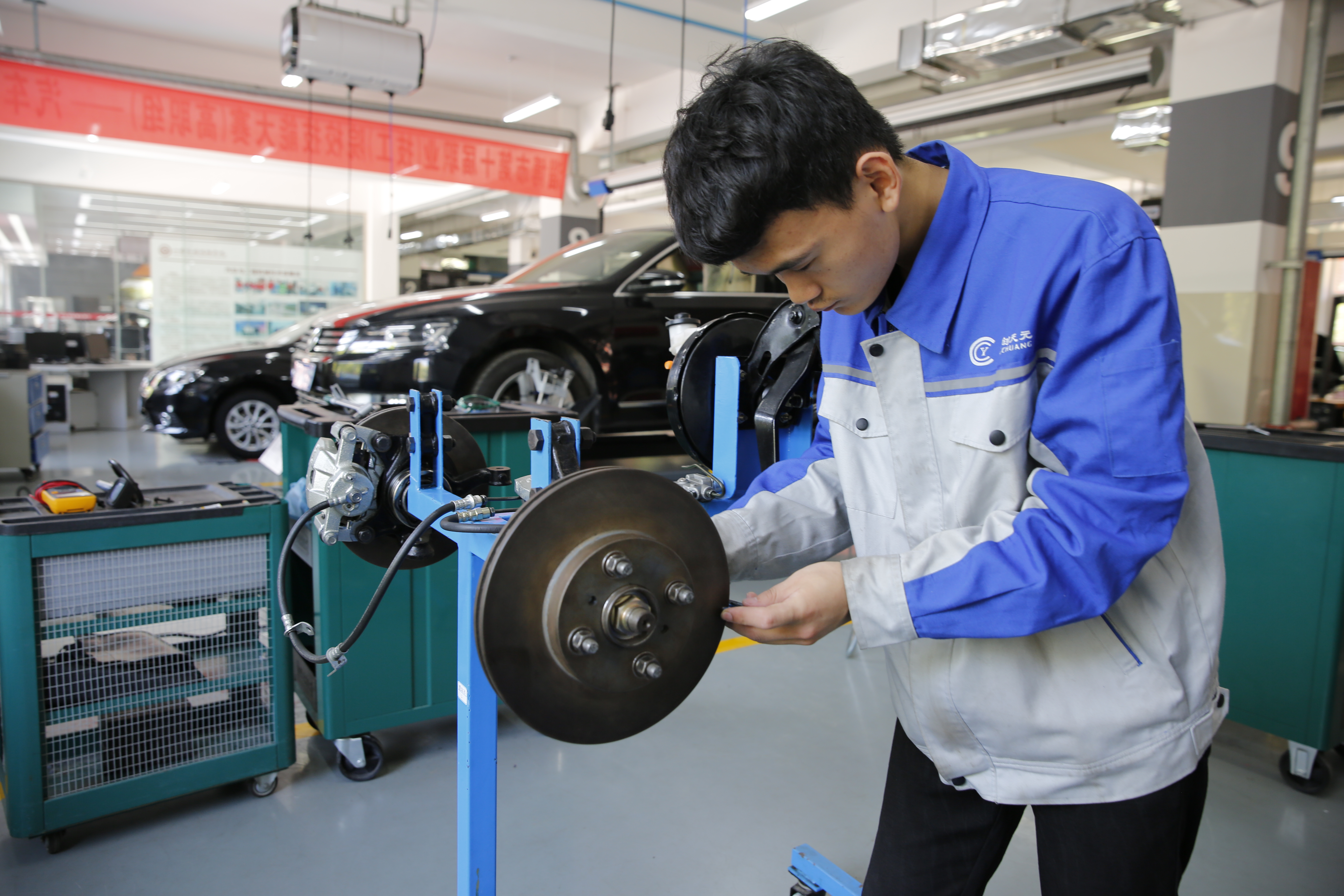 车间里他埋头苦干。要么安静地看书学习,要么在汽车旁边摆弄着工具进行实践训练。兴趣是最好的老师,刘荣兴2018年走进交通工程系,不到一个半月的时间,就报名参加世赛班的选拔考核并成功挤进世赛班,从零开始接触世界技能大赛汽车技术项目。历经半年时间,刘荣兴让自己从一个连扳手都不会用的人变成一个能熟练进行拆装作业和测量作业的人。这半年里,他经历了一次又一次的校内选拔,每一次选拔都是他技能提升的动力,让他敢于面对挑战,大赛面前临危不惧、不断提升自己的心理素质和技能水平。