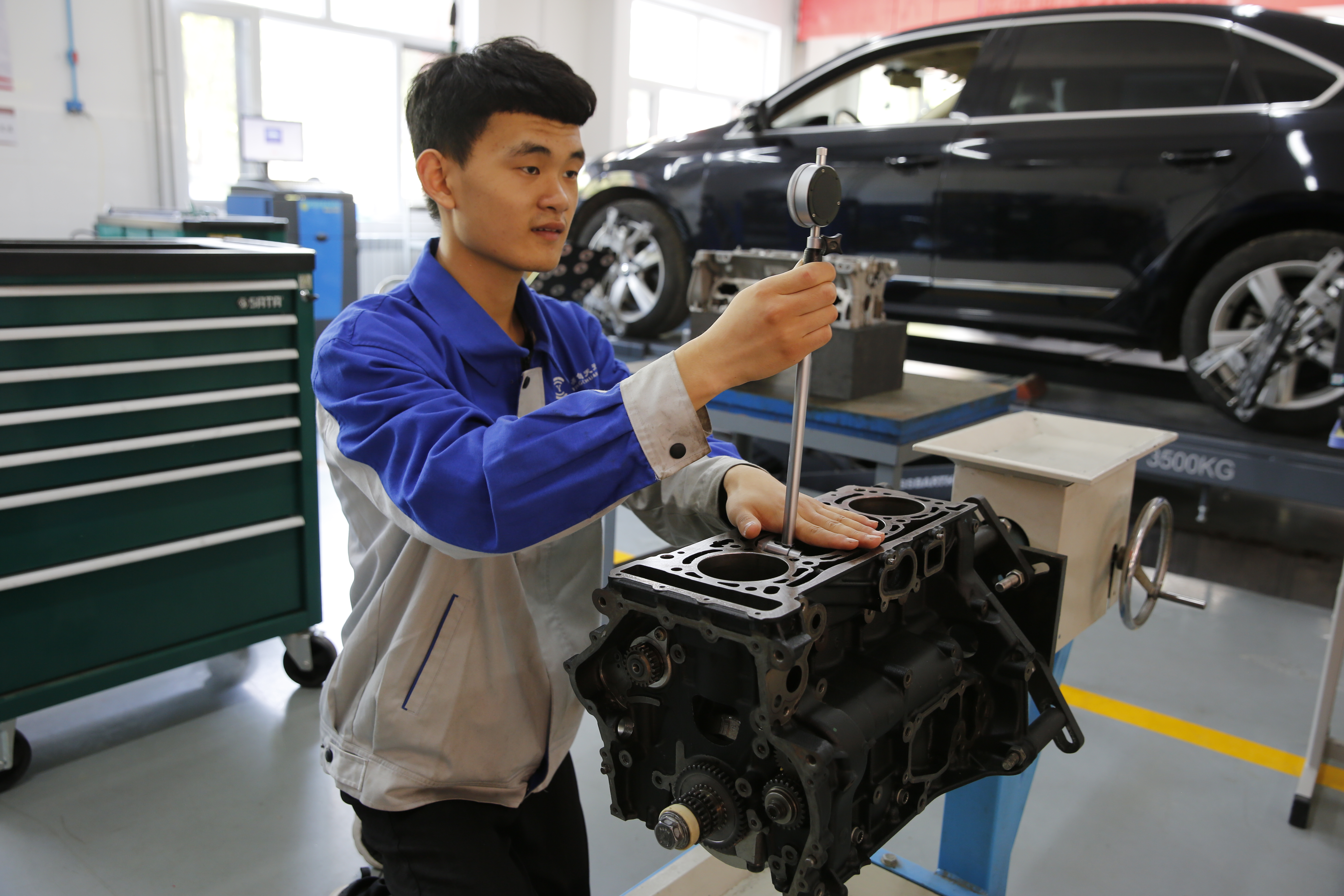 汽车技术项目考核模块多,涉及知识点多。从发动机到底盘、从排除故障到电气构建、从日系车到韩系车到德系车、从中文到英文,每一个模块都需要扎实的知识。这就需要他充满自信、更勤奋、更专注地投身到专业技术学习。慢慢地他也意识到,只是一味地进行拆装训练也会使人厌倦,如果不动脑分析不能提出问题,就不会有大的进步,于是他在实践中也逐渐学会了思考,思考如何能把每一步快速且完美的完成。遇到英文技术材料就一个单词一个单词地去翻译,认真地记录笔记;每天都要总结,无论在拆检过程中,还是故障诊断排除过程中,都本着严谨认真、精益求精、追求完美、勇于创新的精神,踏踏实实认认真真地进行实践训练。