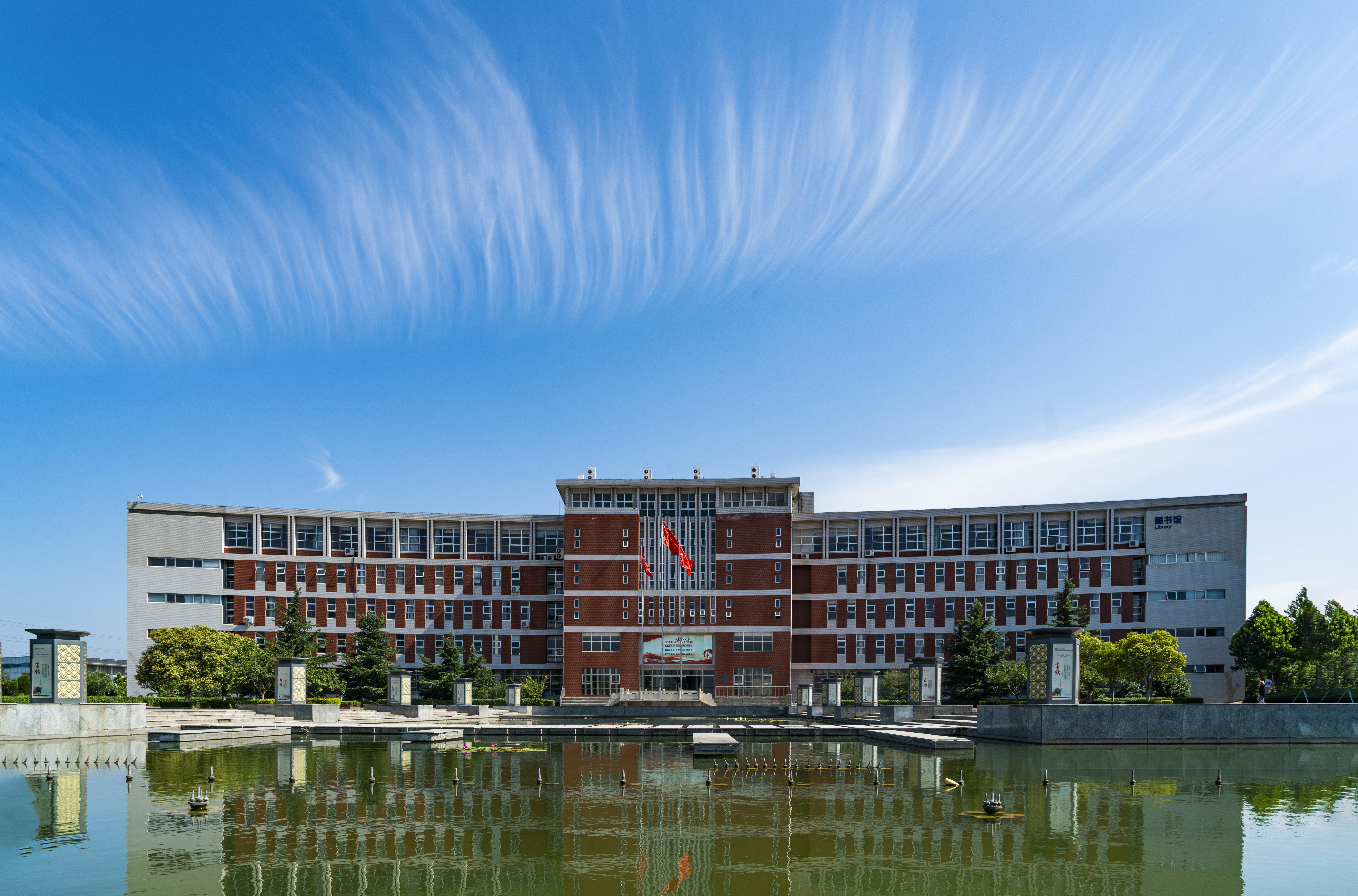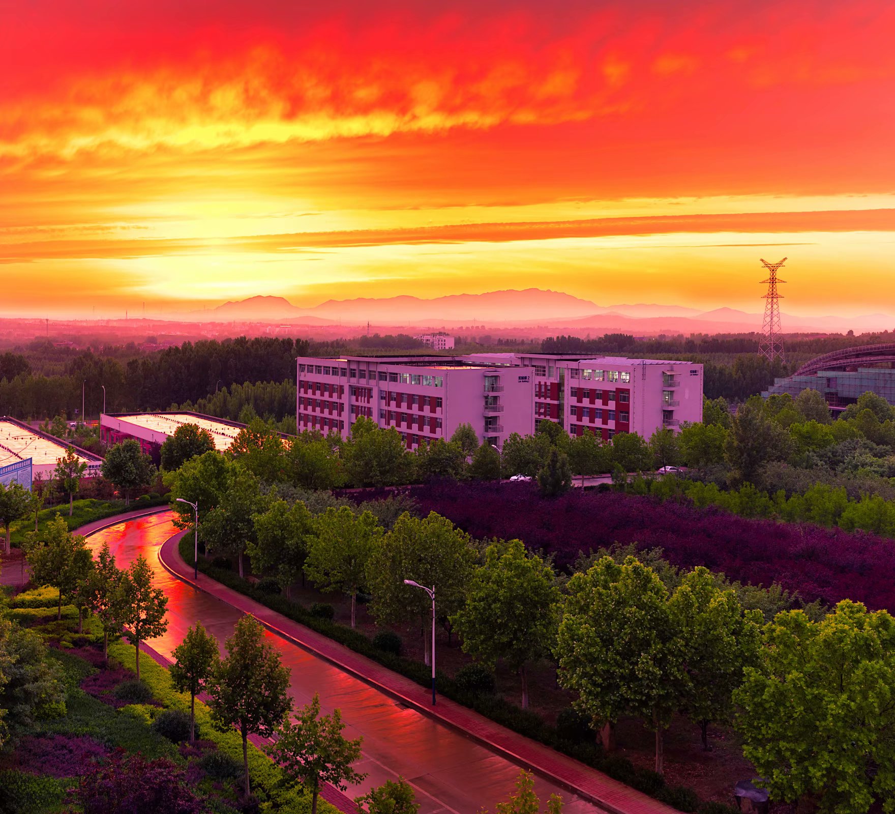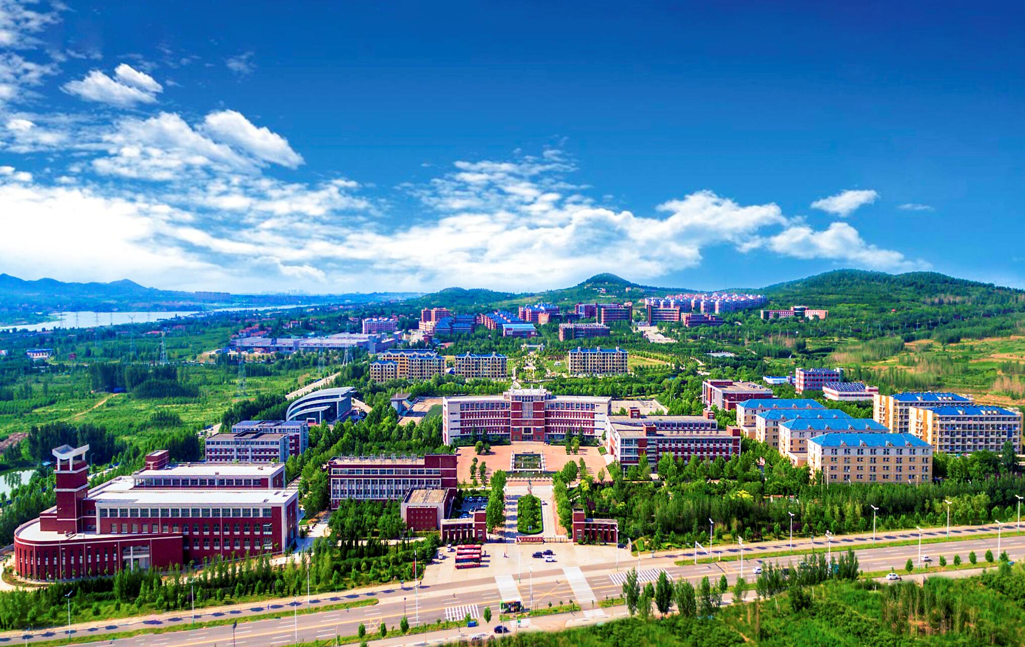 学院哈佛红和象牙白相间的教学建筑群,釉蓝楼顶和缃黄墙宿舍楼群,