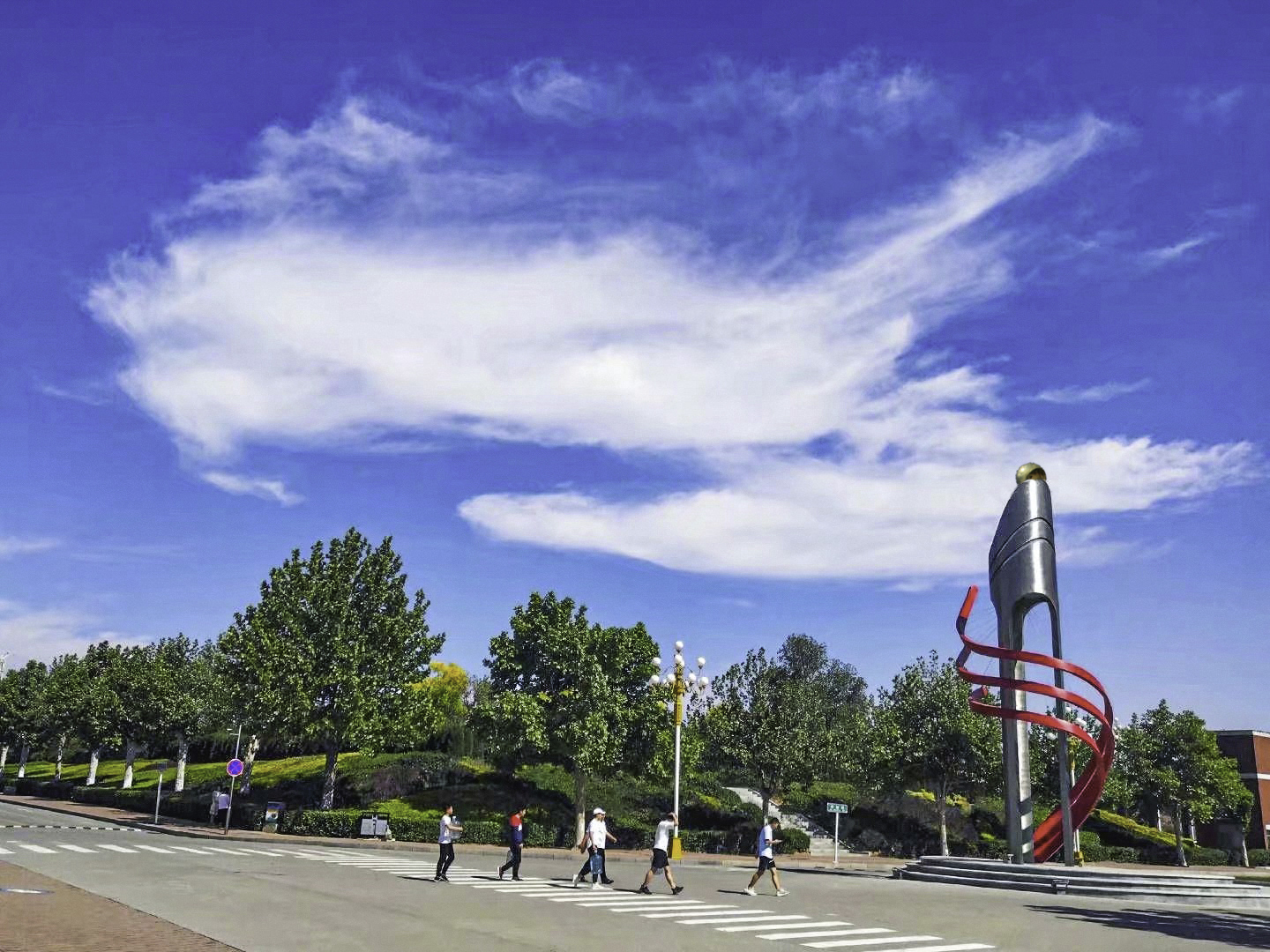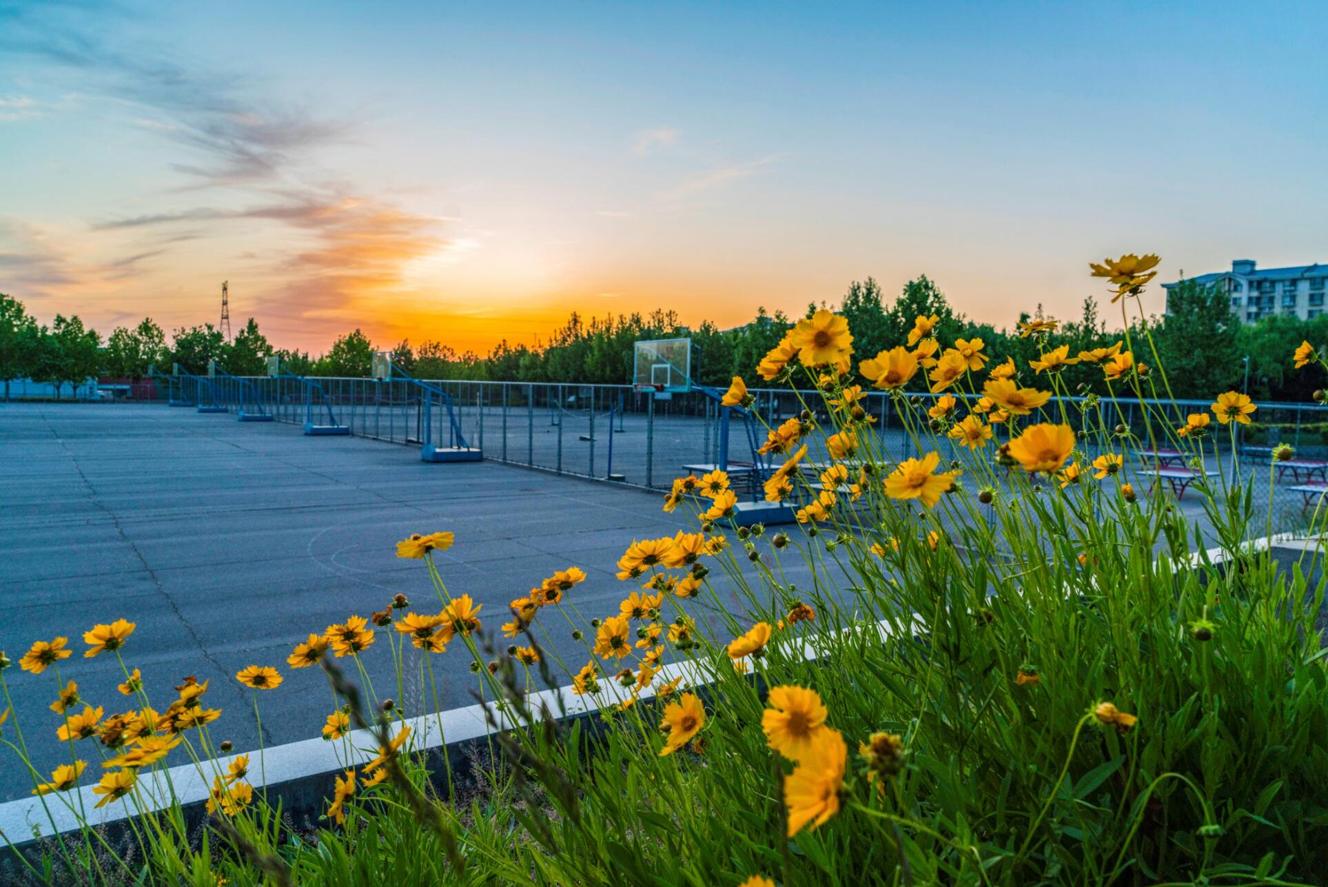 红绿相间的运动场,与蓝天白云交映着,处处可见原色之和美。