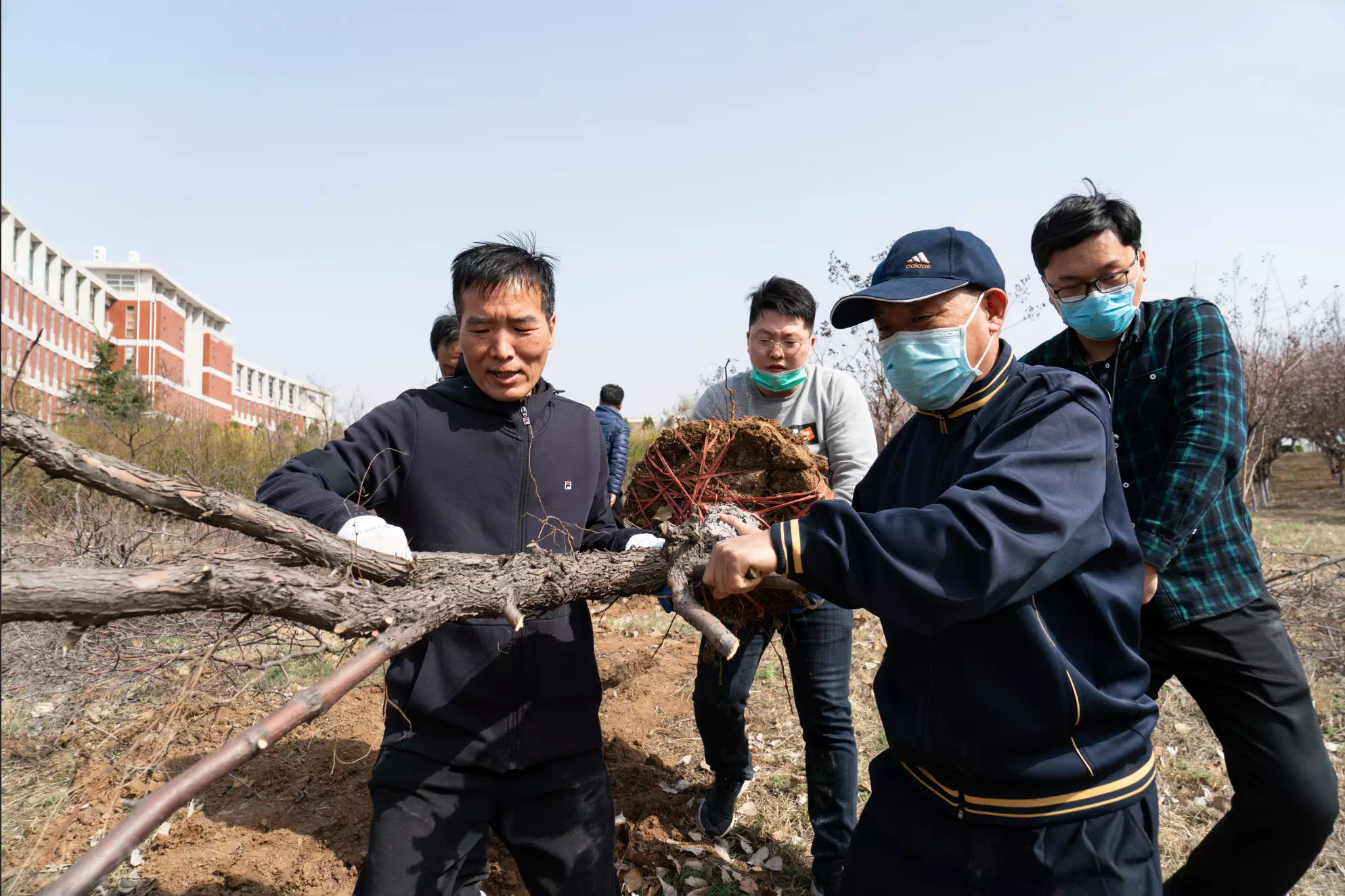 在植树活动现场,大家戴上口罩、扛起铁锨,来到山水广场西侧树林,大家齐心协力抬树、装车,然后来到校园北侧院墙移植地点进行栽植。大家热情高涨,抬树、扶树、培土,浇水,一气呵成、干劲十足。植树现场,巾帼不让须眉,女同志们也个个争先上手。大家齐心协力,互相配合,每个环节衔接紧密、有条不紊。经过大家三天的劳动,77棵枣树已魏然挺立在校园北侧,为大美水院再添一抹新绿。