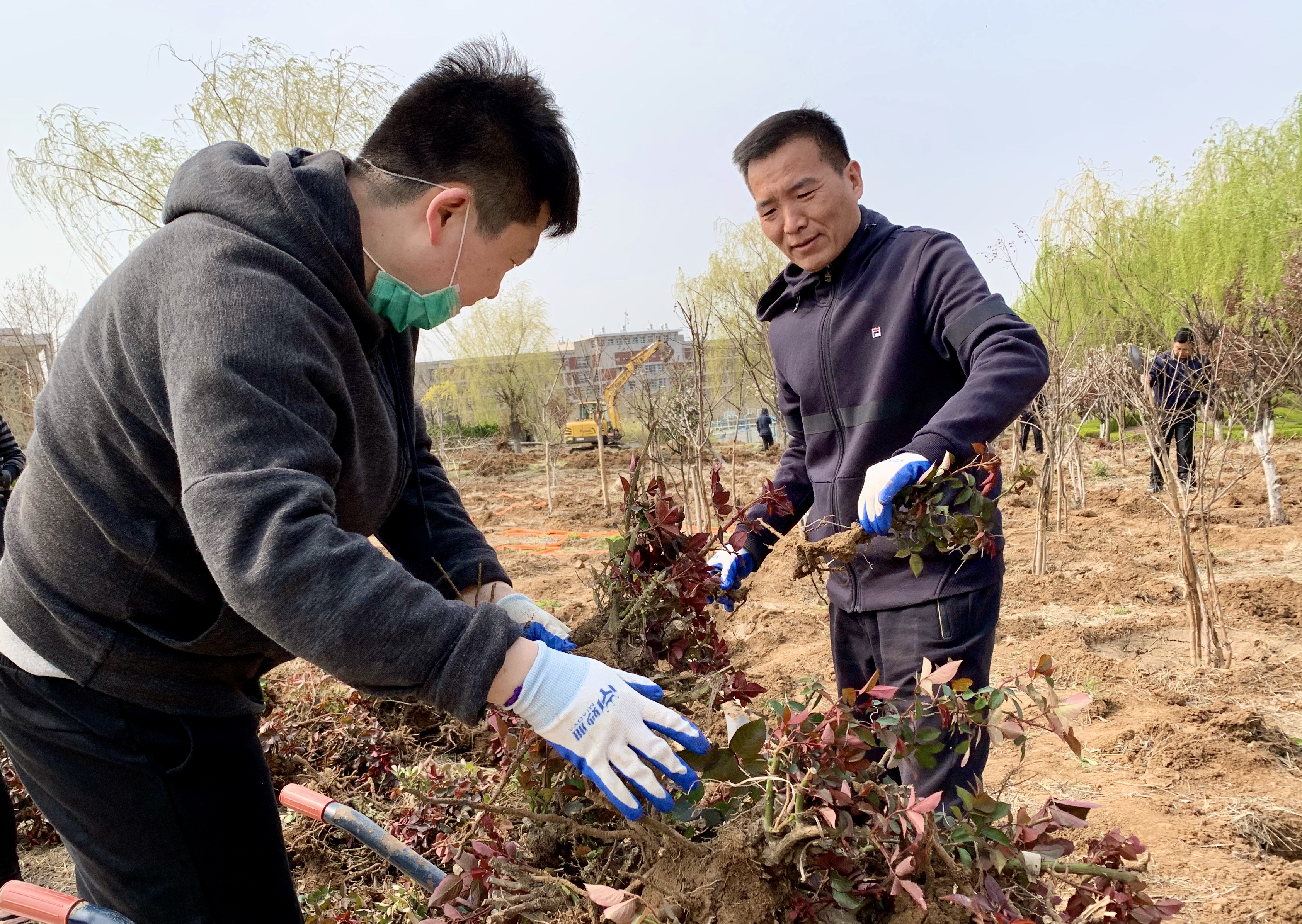 又是一年芳草绿,依然十里桃花红。清明节前夕,正是花草树木移植的大好时机。3月31—4月3日,学院各支部组织教职工200余人,分批次将萌源河南岸和图书楼北侧的1200余株月季移植到校园北区尚德路新建月季园。