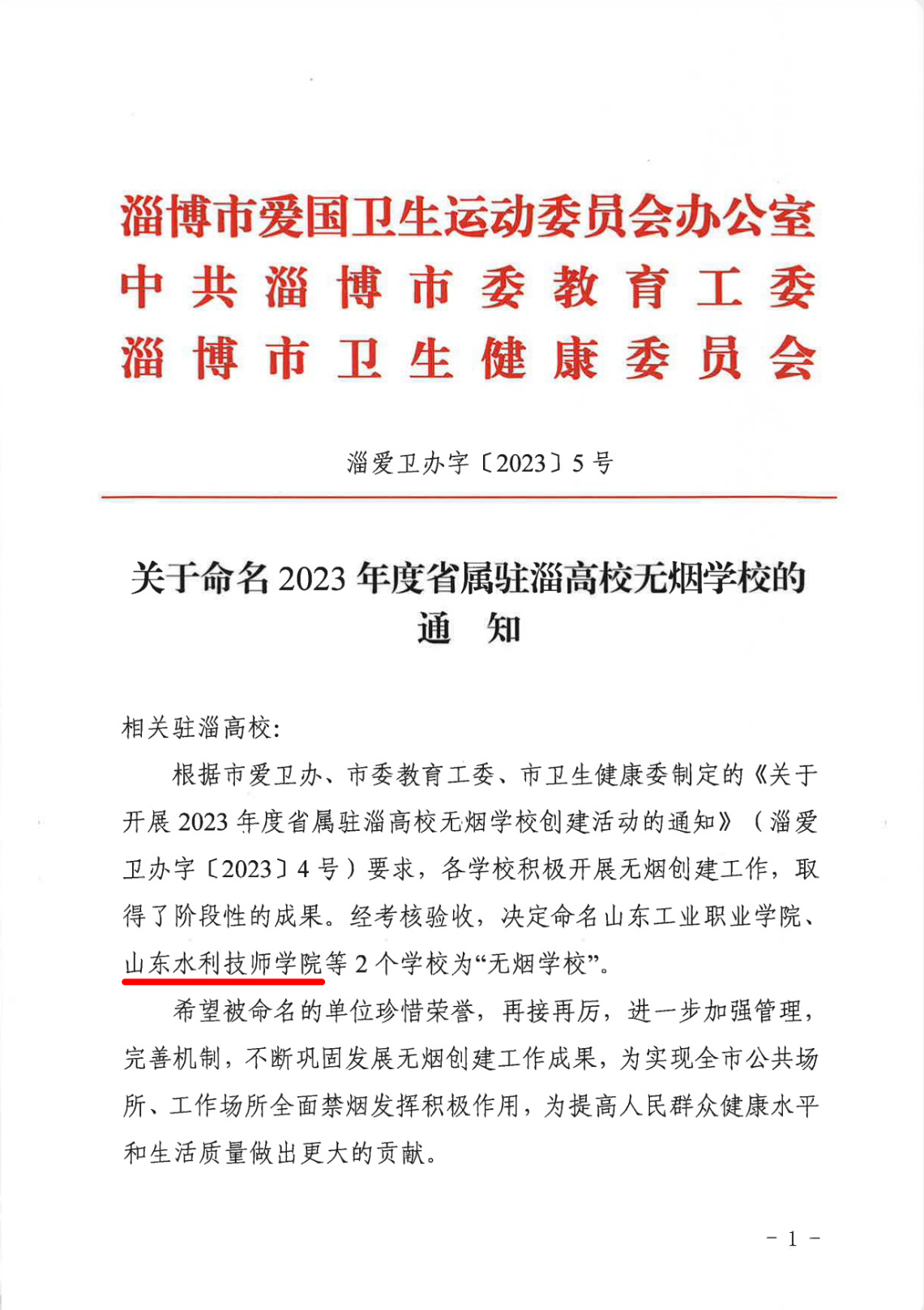11月30日,淄博市爱卫办、淄博市教育工委、淄博市卫生健康委公布2023年度省属驻淄高校“无烟学校”名单,山东水利技师学院获此殊荣。
