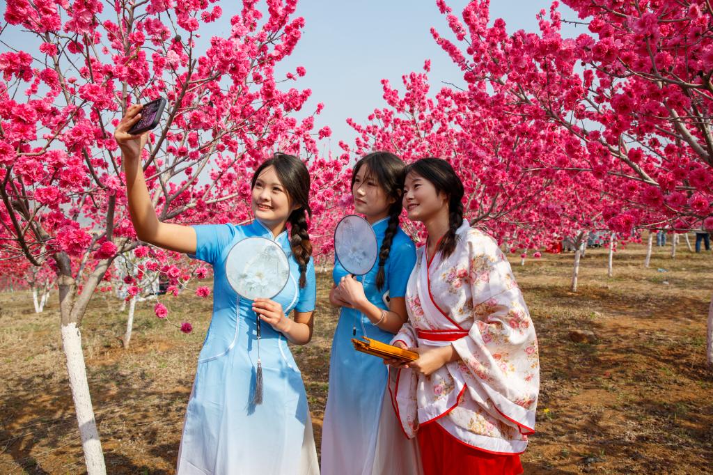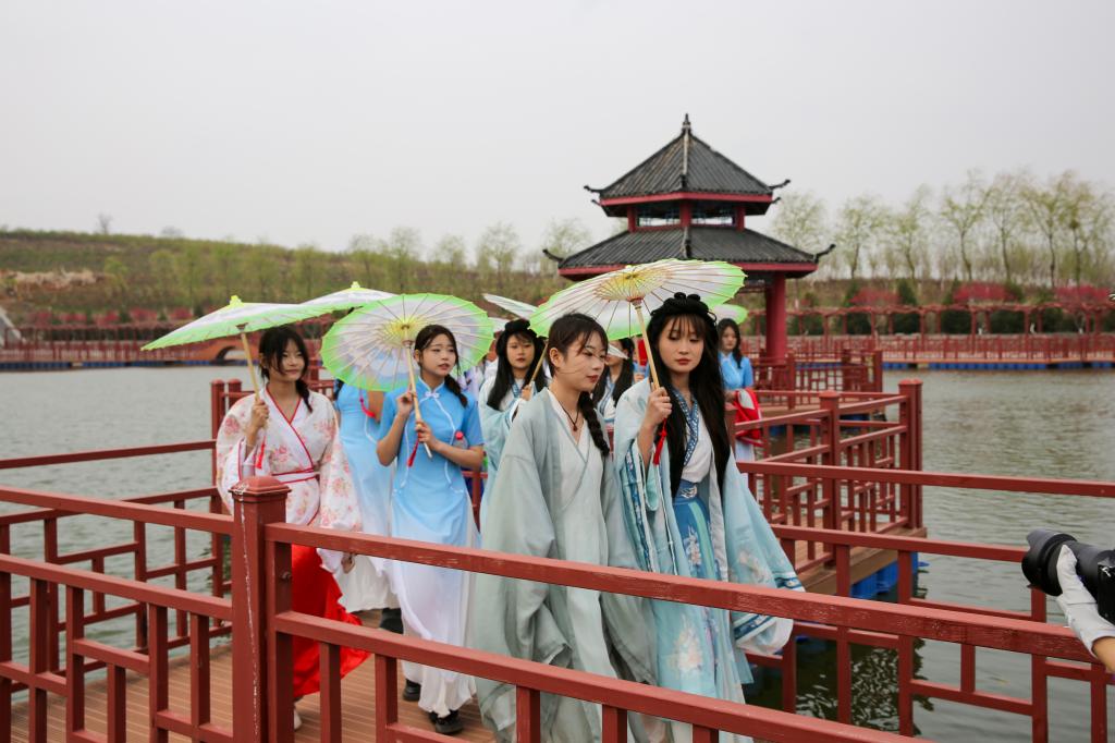 活动中,身着汉服的学生们在桃花花海中穿梭徜徉,体验大自然的馈赠,感受春天的生机;驻足在山涧中建立的湖心亭中,观赏水中自在游弋游的鱼儿……吸引着活动现场的众多摄影师们“长枪短炮”齐上阵,将一个个人与自然和谐美好的镜头一一定格。“身着美丽的传统服饰,撑伞漫步,欣赏着镶月湖公园的美景,还能让更多的人了解传统文化,参加这样的活动很有意义。”学生田瑶瑶由衷地说。