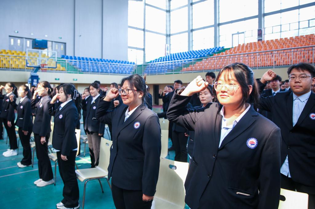 仪式在庄严的国歌声中拉开帷幕。与会领导、各系部团总支书记、老团员代表为新团员一一佩戴团徽。新团员高举右拳,面对鲜红的团旗庄严宣誓,表达对共青团的无限向往和青春心向党的坚定决心与信念。