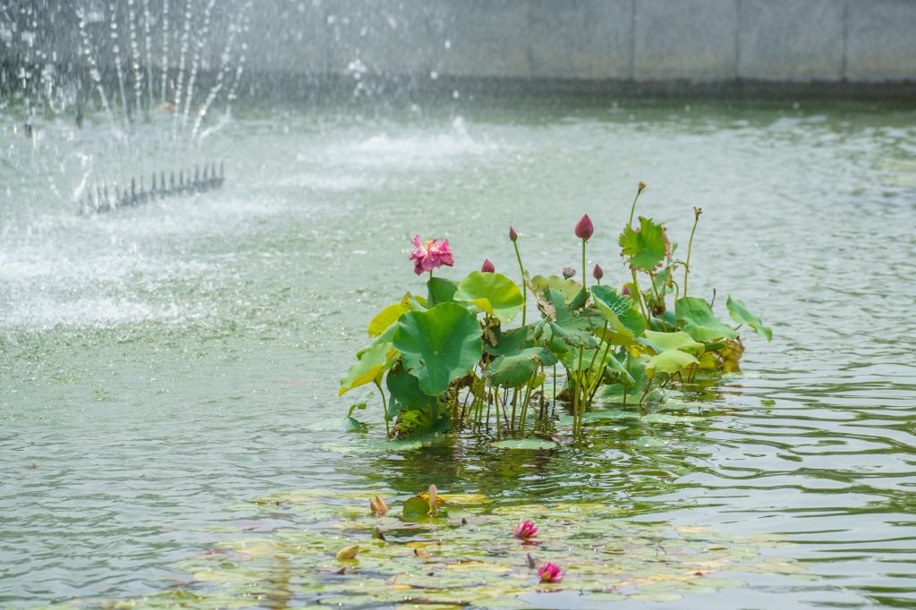 毓秀塘内,从水底汩汩涌出的水柱,泛起堆堆雪白的浪花,撩拨着满塘荷叶浅吟低唱。一朵朵荷花在水中央亭亭而立,或含苞待放或舒展盛开。微风吹过,片片荷叶迎风摇曳,朵朵荷花随风起舞,阵阵清香袭人心扉。细细观察,阳光穿透荷花有着别样的光影景色,株株都美得独立,美得和而不同,引得路过的师生纷纷驻足观赏,掏出手机打卡留念。