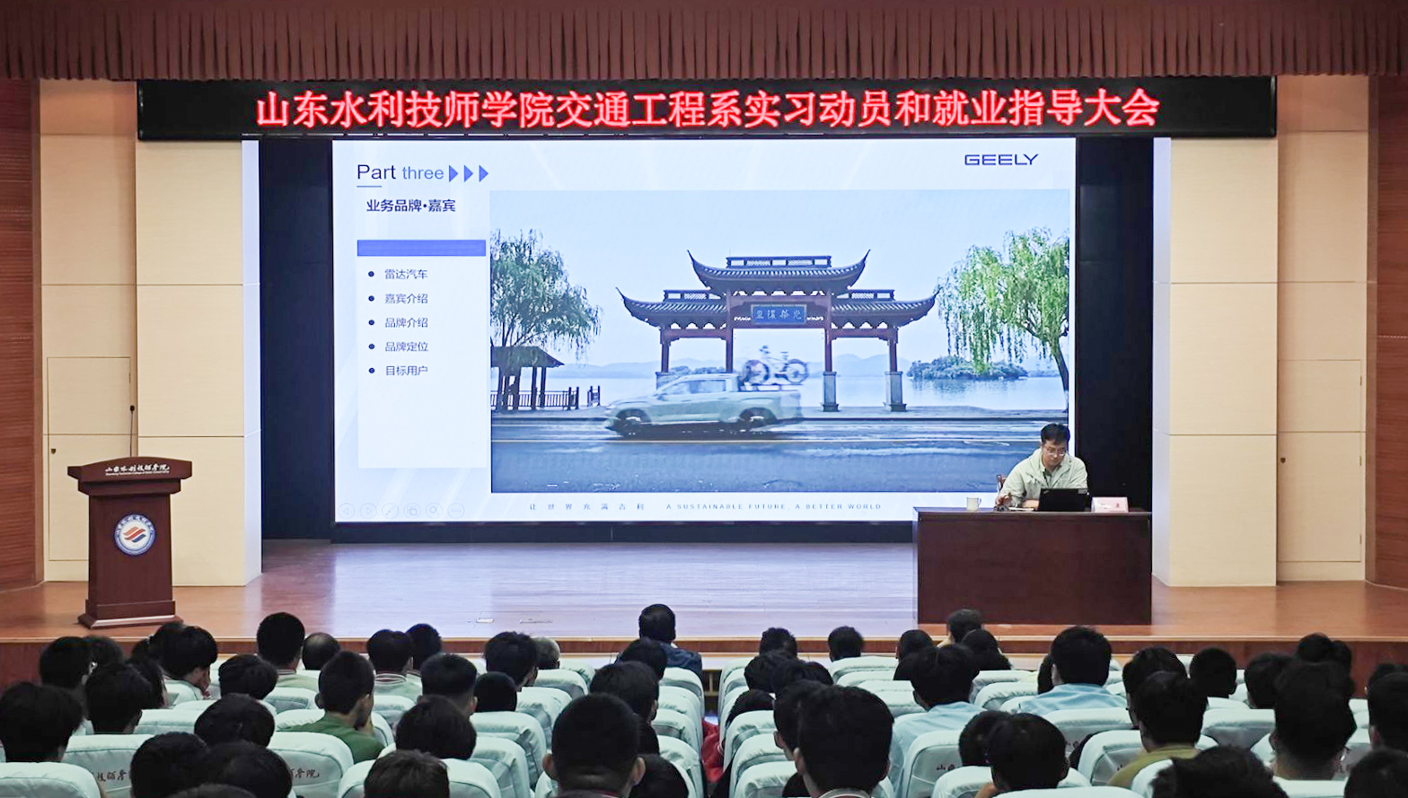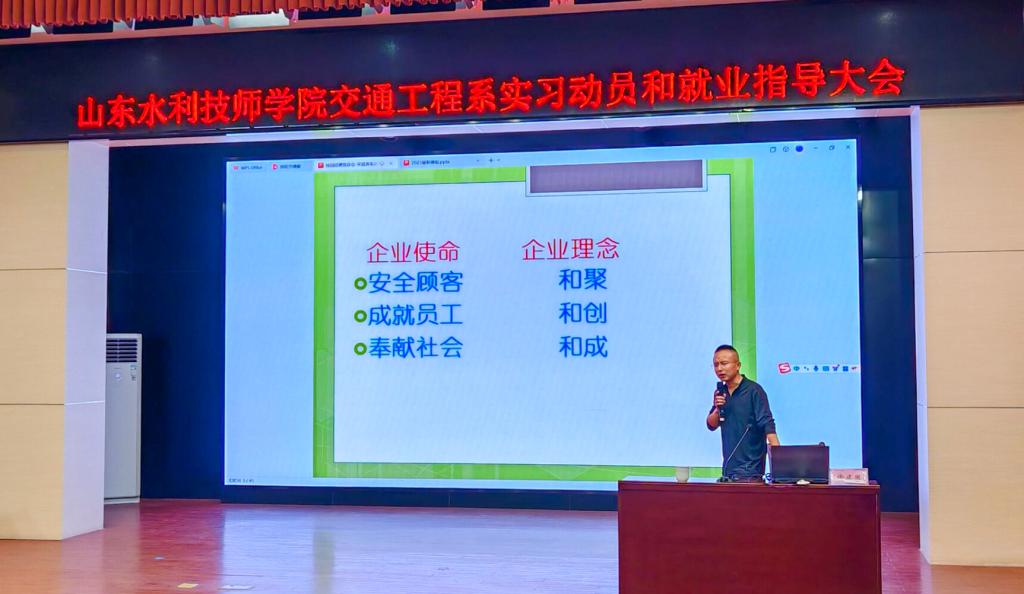 5月23日,学院交通工程系召开实习动员和就业引导大会。山东吉利商用车有限公司人力资源部科长赵康、山东宋哥养车经理徐建国受邀出席。
