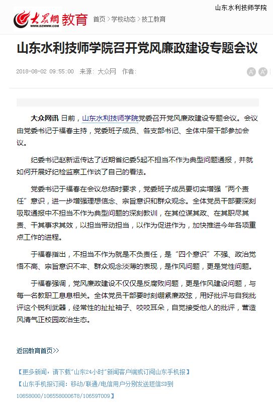大众网讯 日前,山东水利技师学院党委召开党风廉政建设专题会议。会议由党委书记于福春主持,党委班子成员、各支部书记、全体中层干部参加会议。